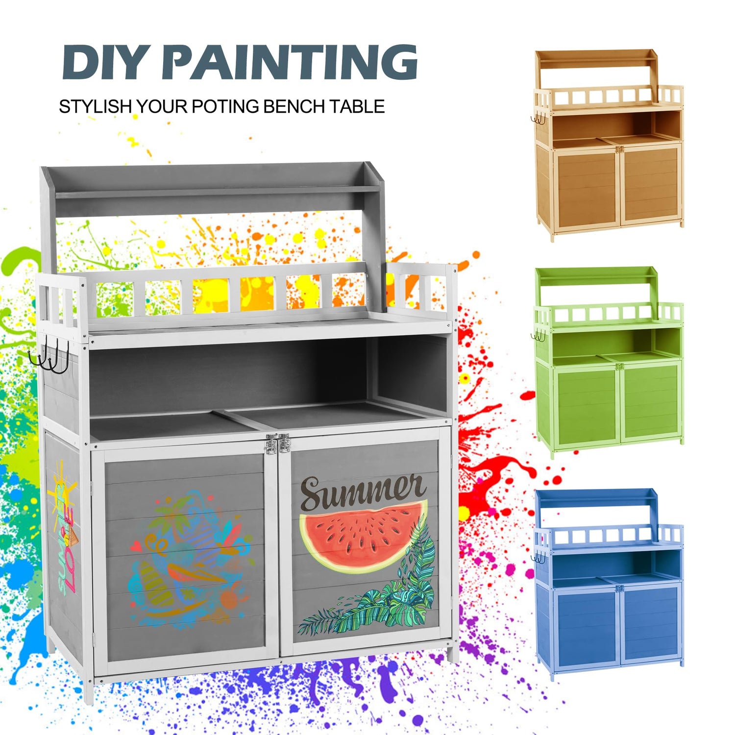- [Green Materials Reveal A Natural Beauty] Made of 100% fir wood which holds up well to the elements, this potting work bench station for horticulture is body-harmless and easy to clean. The fine paint technology and no pungent smell are friendly to your family and pets, not only enriching the color of the product but also adorning your garden.