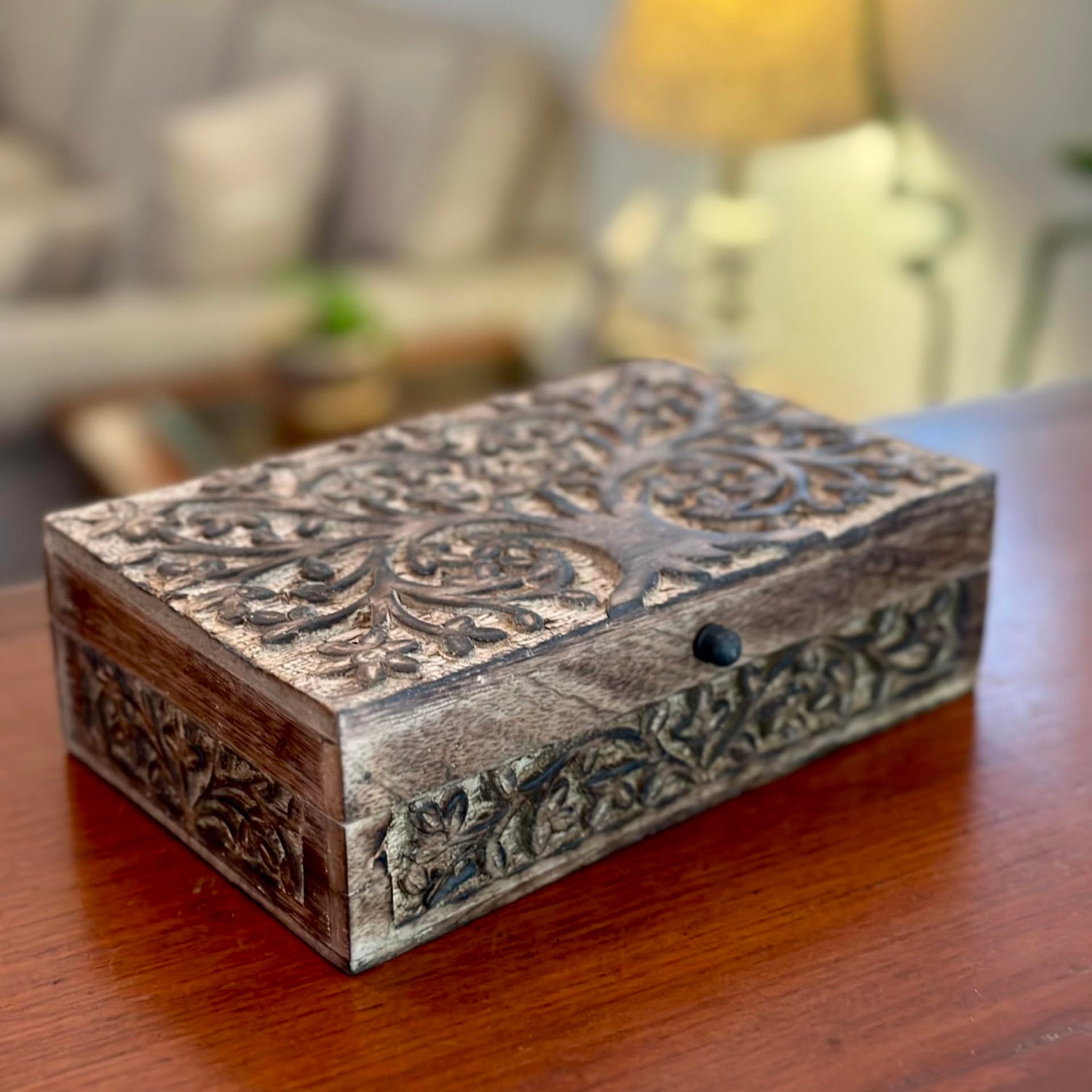 - HIGH QUALITY: Strong hinges. Lasts forever. Rustic look & feel with a gorgeous antique finish, which sets this box apart. A beautiful handmade carving of THE TREE OF LIFE decorates the box surface