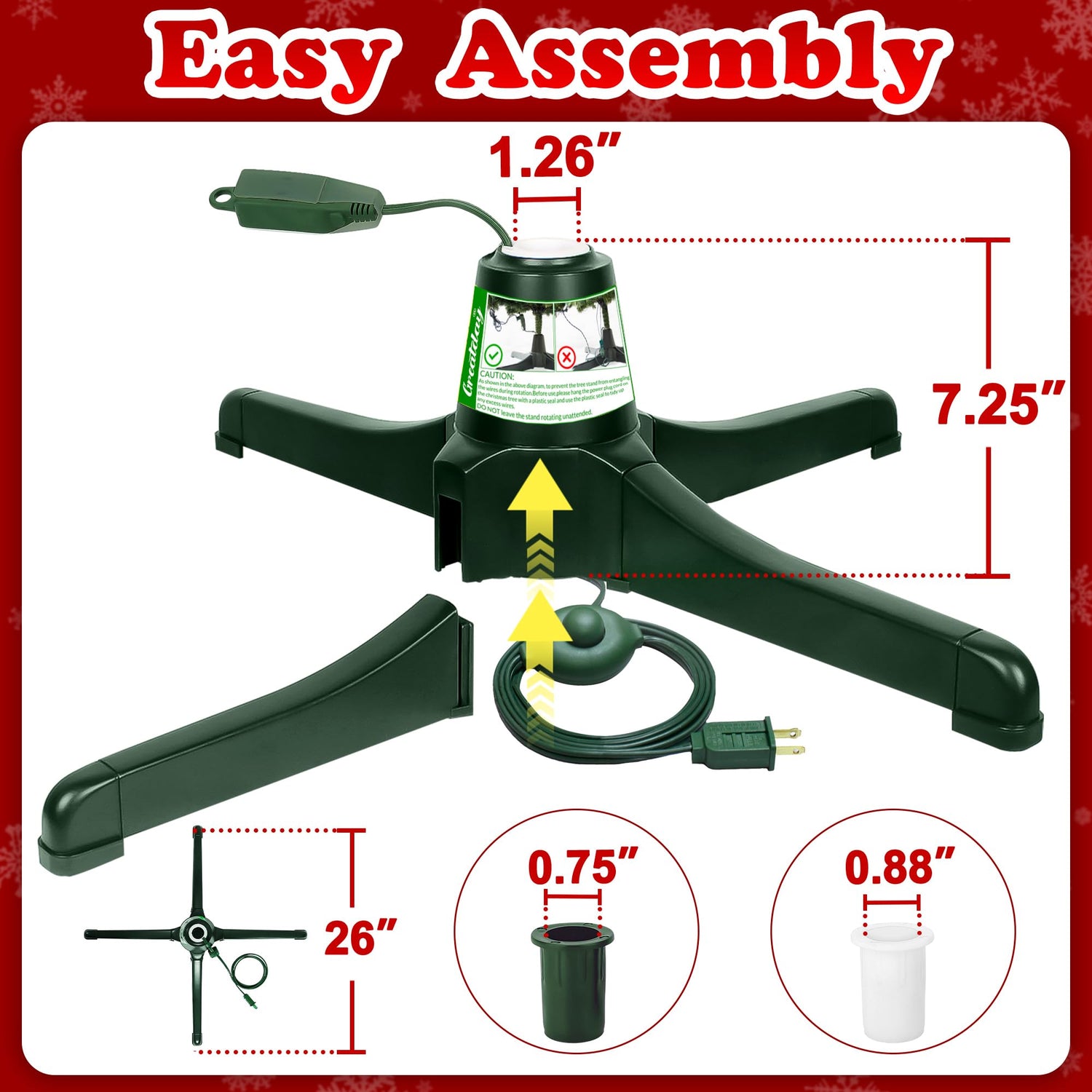 - Sturdy and Durable: Our rotating tree stand is designed to support trees up to 7.5 feet tall and weighing up to 80 lbs. It features adjustable fittings to accommodate artificial trees with pole trunk diameters of 0.75", 0.88", or 1.25".
