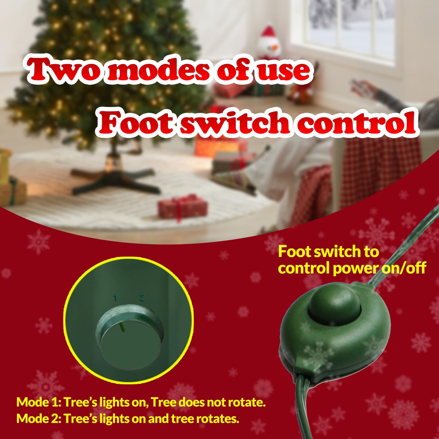 - Functionality: The stand offers two operating modes: 1,The tree lights up without rotating; 2,The tree lights up and rotates. Use the foot switch to easily control the on/off function. The stand rotates 360 degrees, completing one rotation in approximately 1.5 minutes.