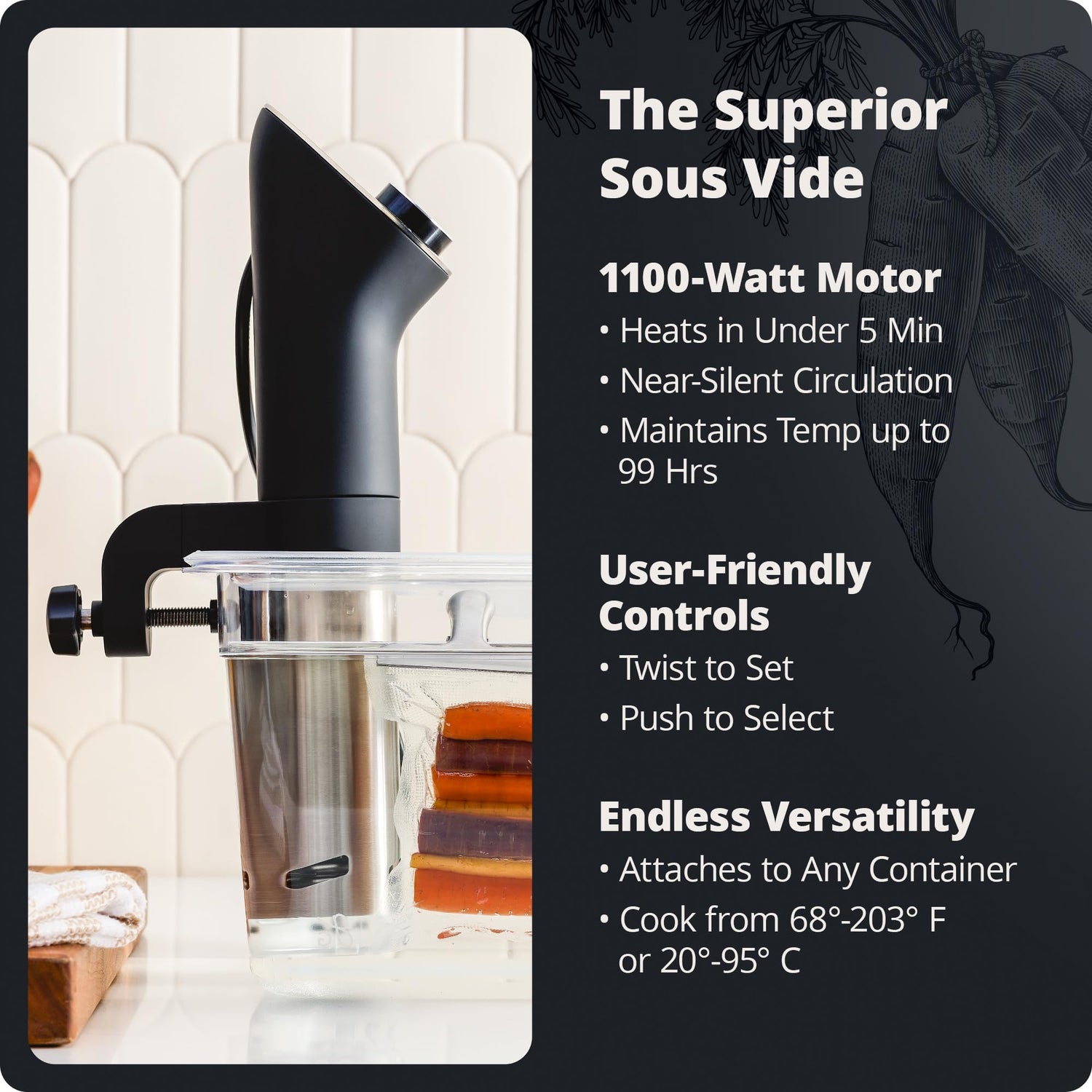 - A Silent Symphony: A powerful yet quiet precision cooker with high-end water circulation that heats evenly in all directions. At 1100 watts get your desired temperature in no time, and all you will hear is a gentle ripple.