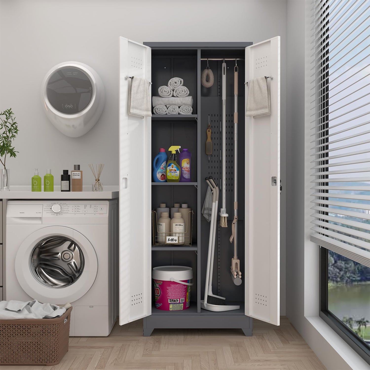 - 🧹【Broom Closet Storage Cabinet】2 Sizes Available: 72.8"H or 65H. This metal garage storage cabinet is made of pure steel material with a powder-coated surface, which is waterproof and easy to clean, ensuring long-term use. The perforated panel design prevents moisture and allows for breathability.