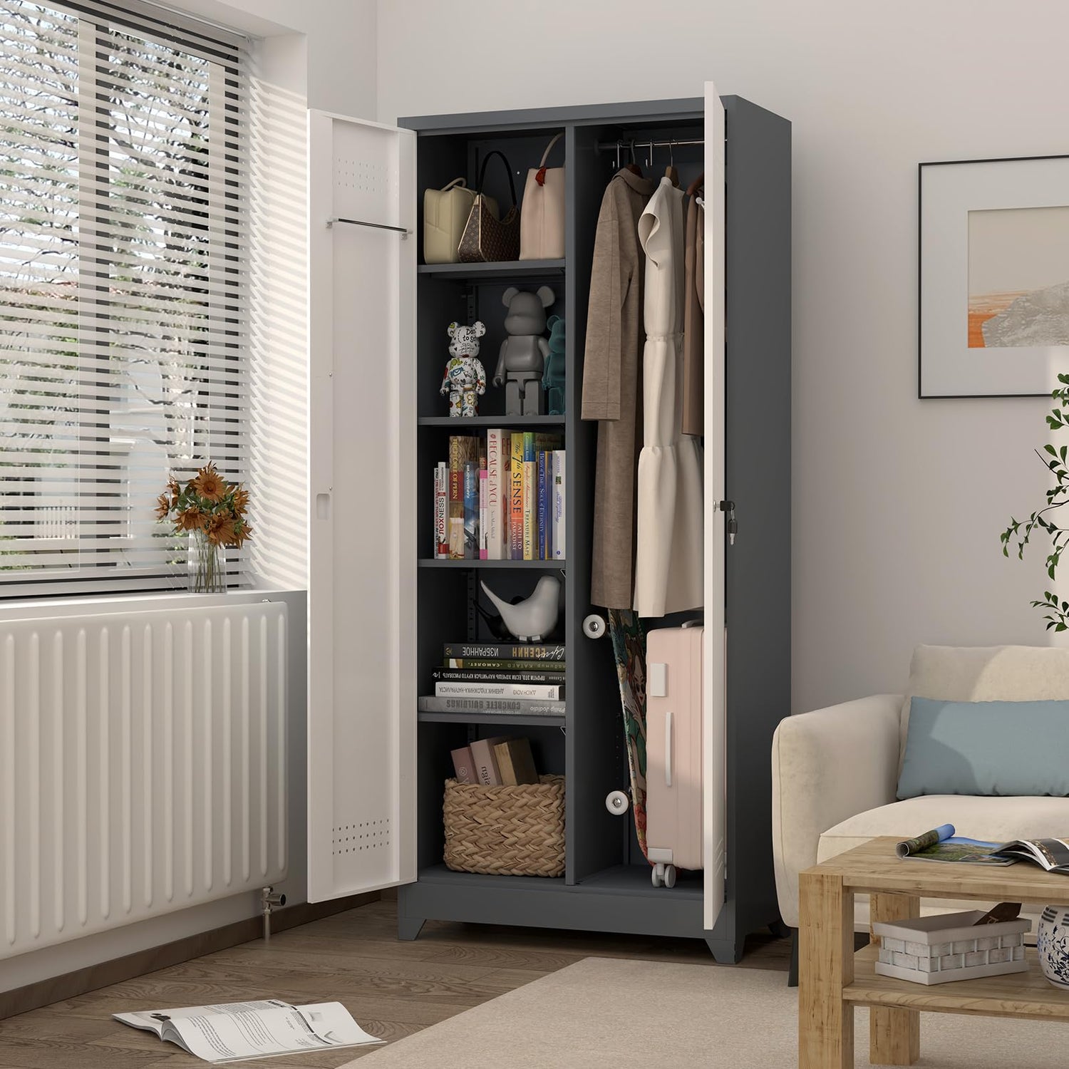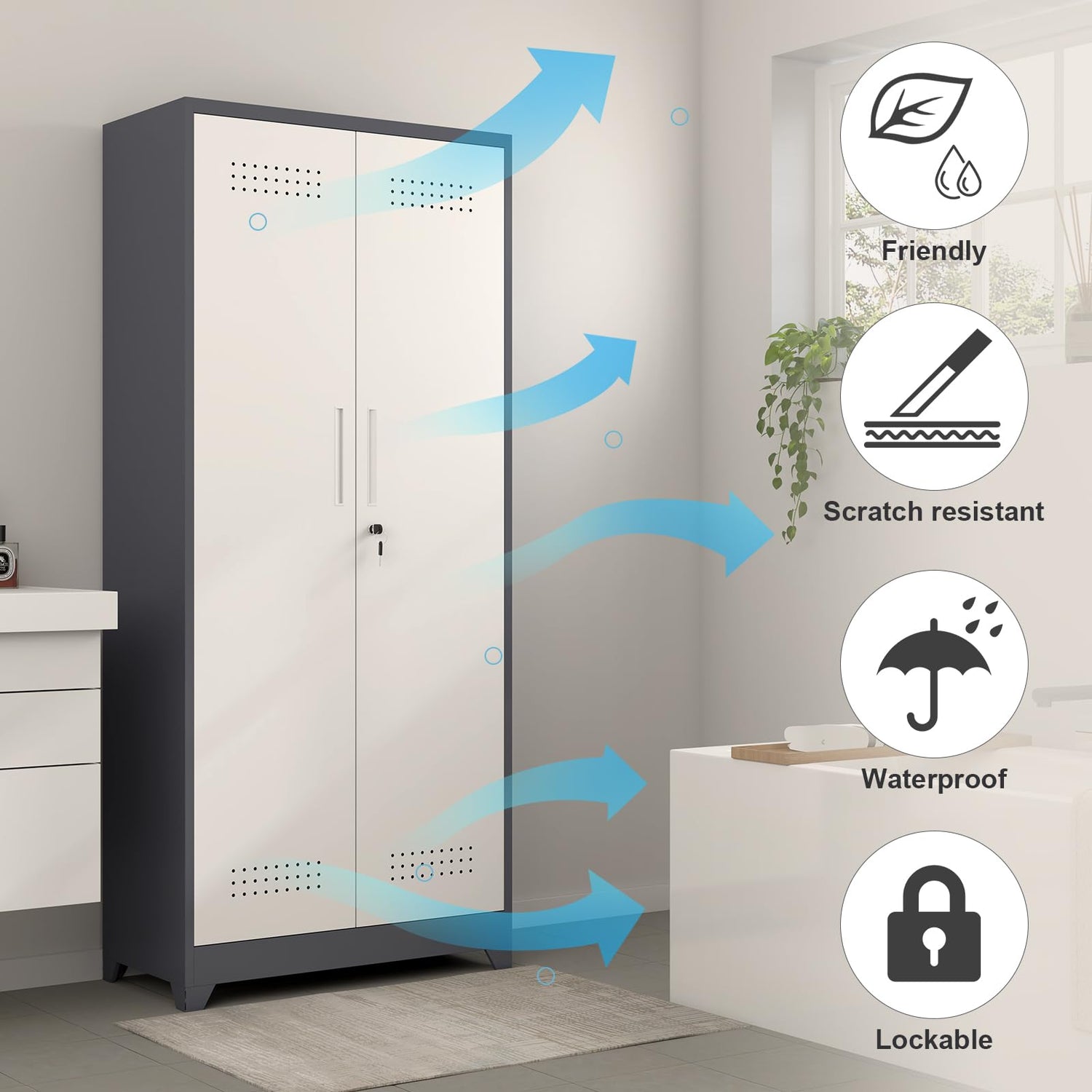 GREATMEET 72.8" H Metal Garage Storage Cabinets, Lockable Broom Closet Storage Cabinet with Doors and Shelves, Utility Cabinets for Storage Locker, Grey-White