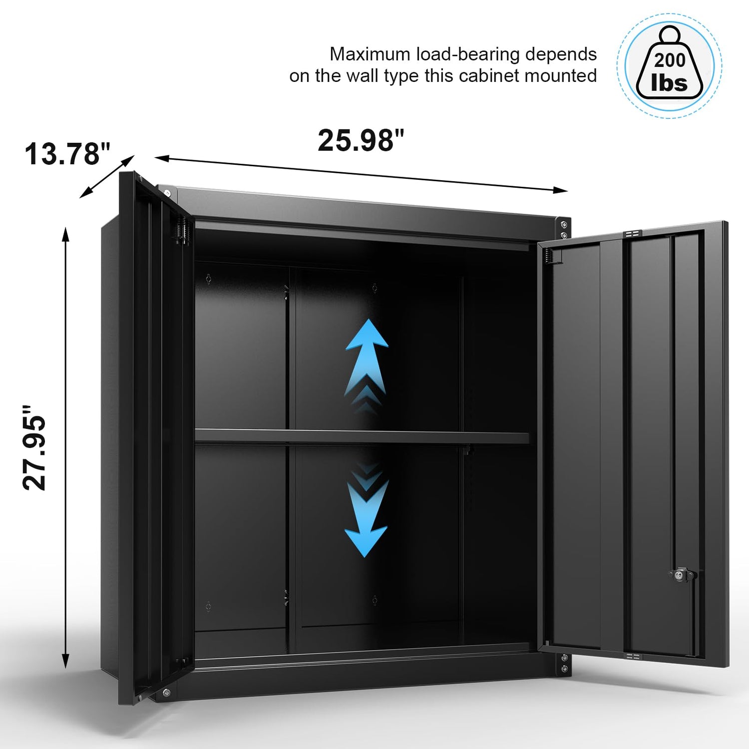 - 【Metal Cabinet for Storage】This metal cabinet is made for storage. A durable wall mounted cabinet with removable and adjustable shelf, lockable doors, medium size, you will find it suitable for your garage, home office, bathroom, pantry or utility room