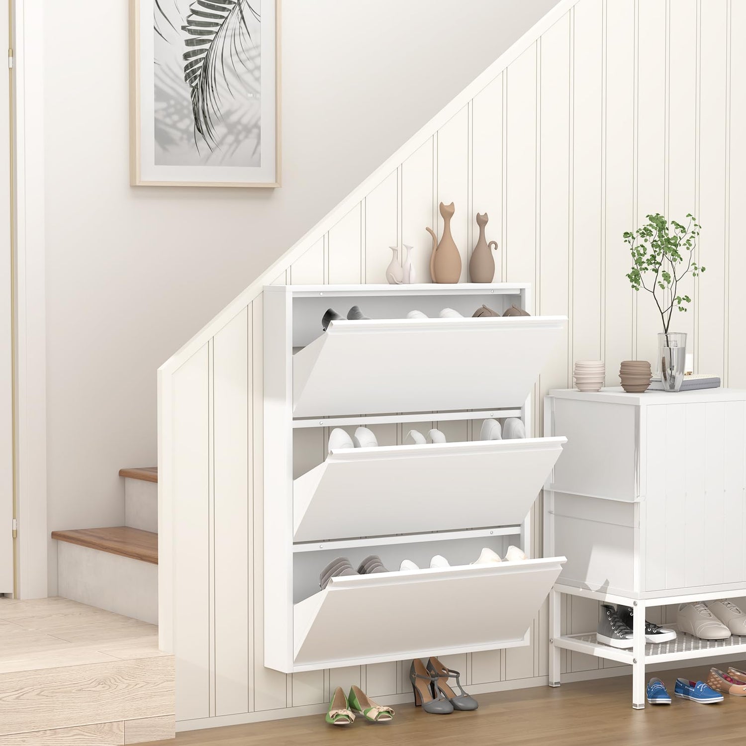 GREATMEET Shoe Cabinet Storage for Entryway, Narrow Shoe Storage Cabinet for Entryway Slim, White Metal Hidden Shoe Cabinet with 3 Flip Drawers, Wall Mounted