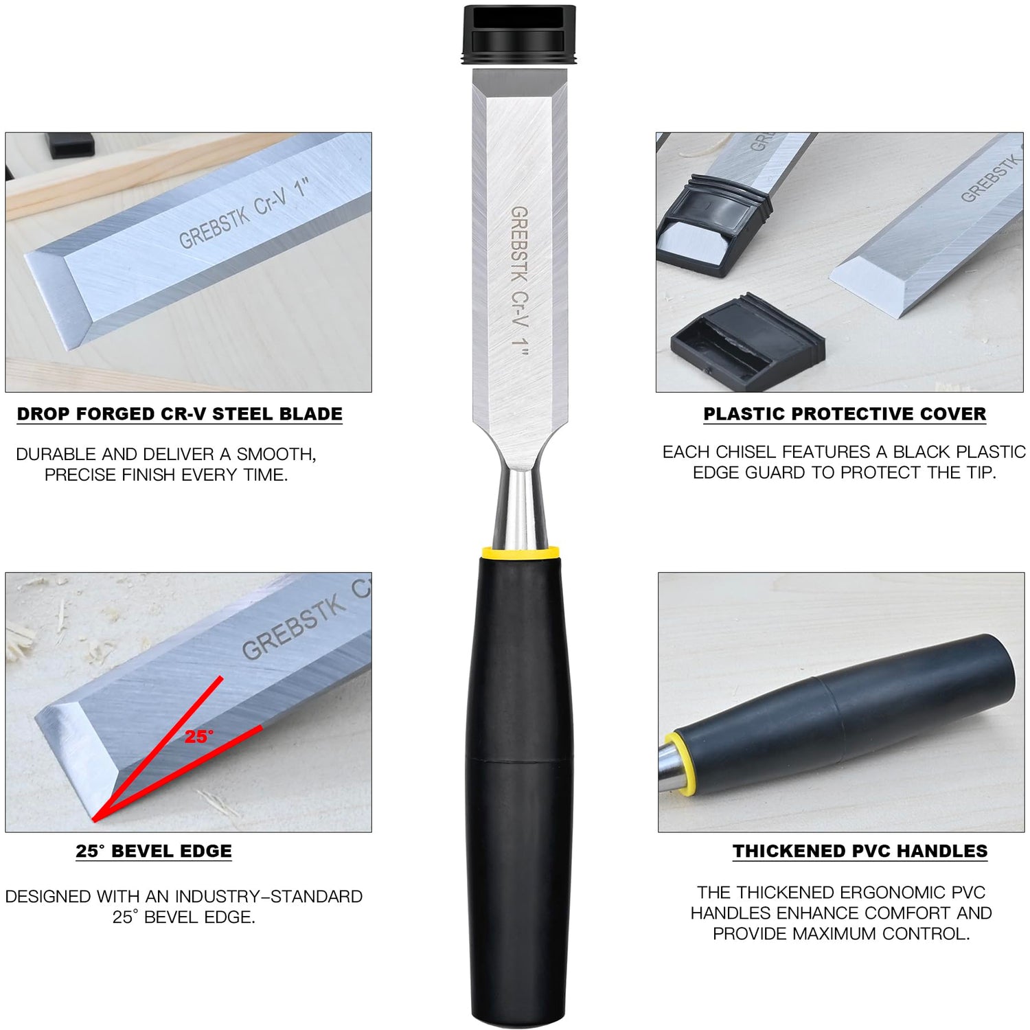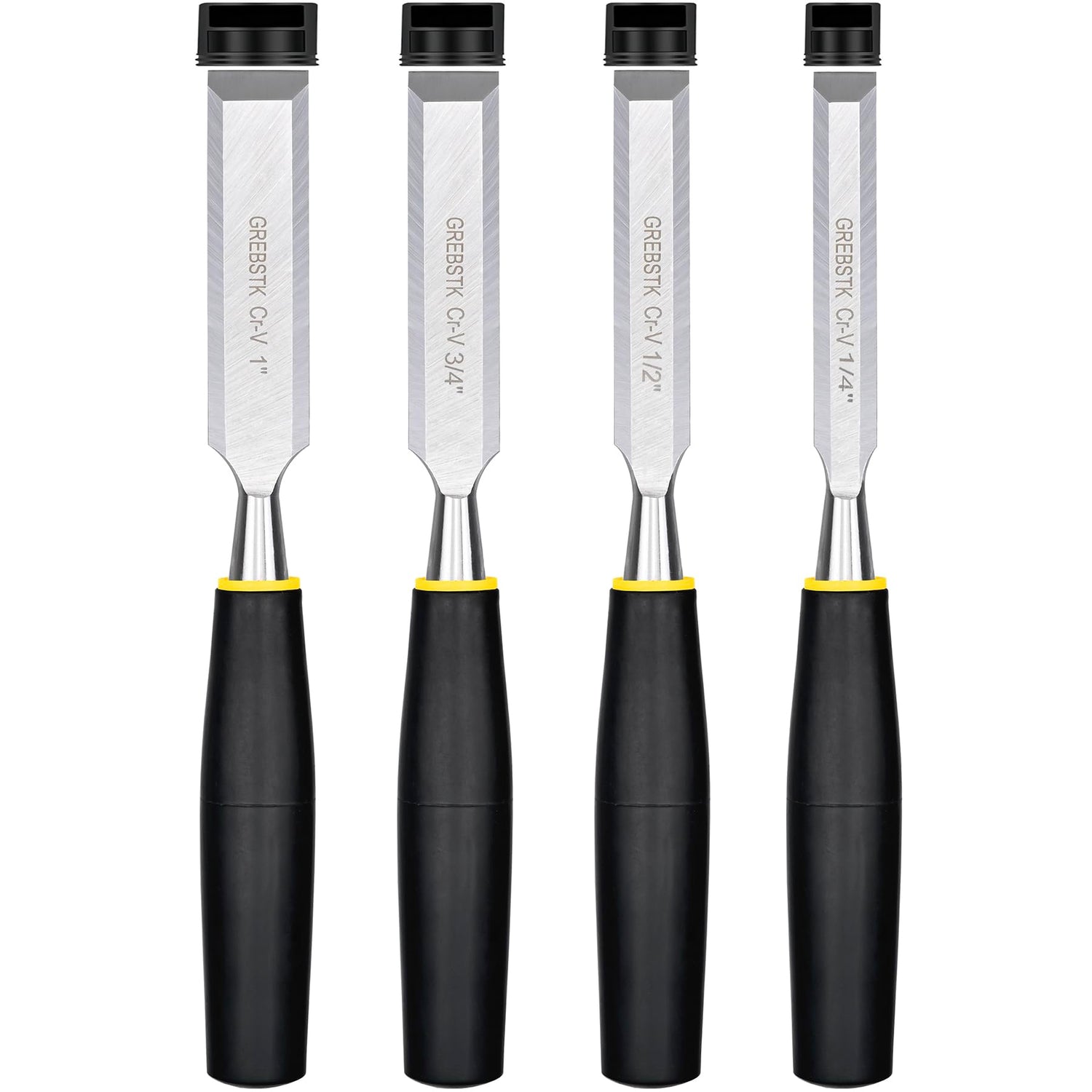 GREBSTK 4 Piece Wood Chisel Set for Woodworking, Professional CR-V Steel Bevel-Edge Bench Chisels, Extra Large High Impact Handle