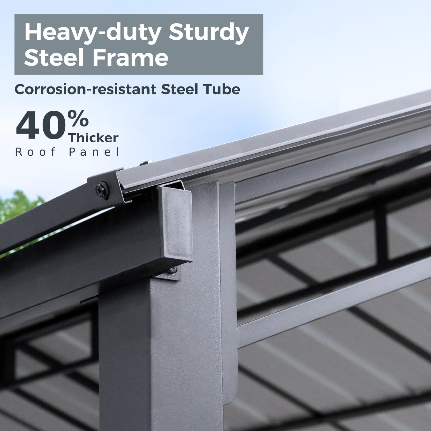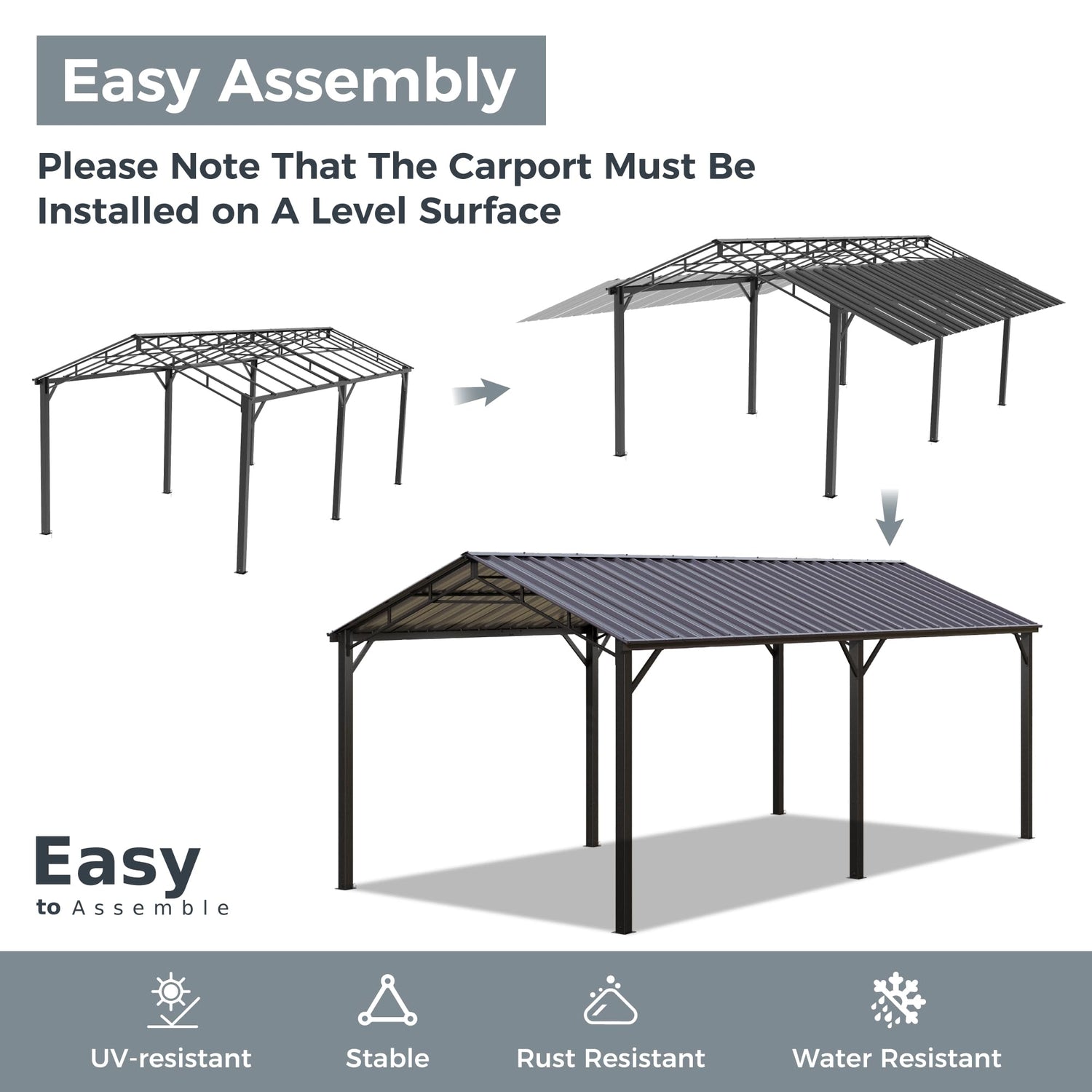 - 【Heavy-Duty Outdoor Metal Carport】 Unlike traditional carports with fabric covers, we’ve upgraded our heavy-duty carport canopy to feature a galvanized steel roof, enhancing its ability to withstand any weather conditions. Constructed with a heavy-duty galvanized steel roof and a powder-coated tube frame, our outdoor metal carport canopy is rust-resistant, solid, and sturdy.