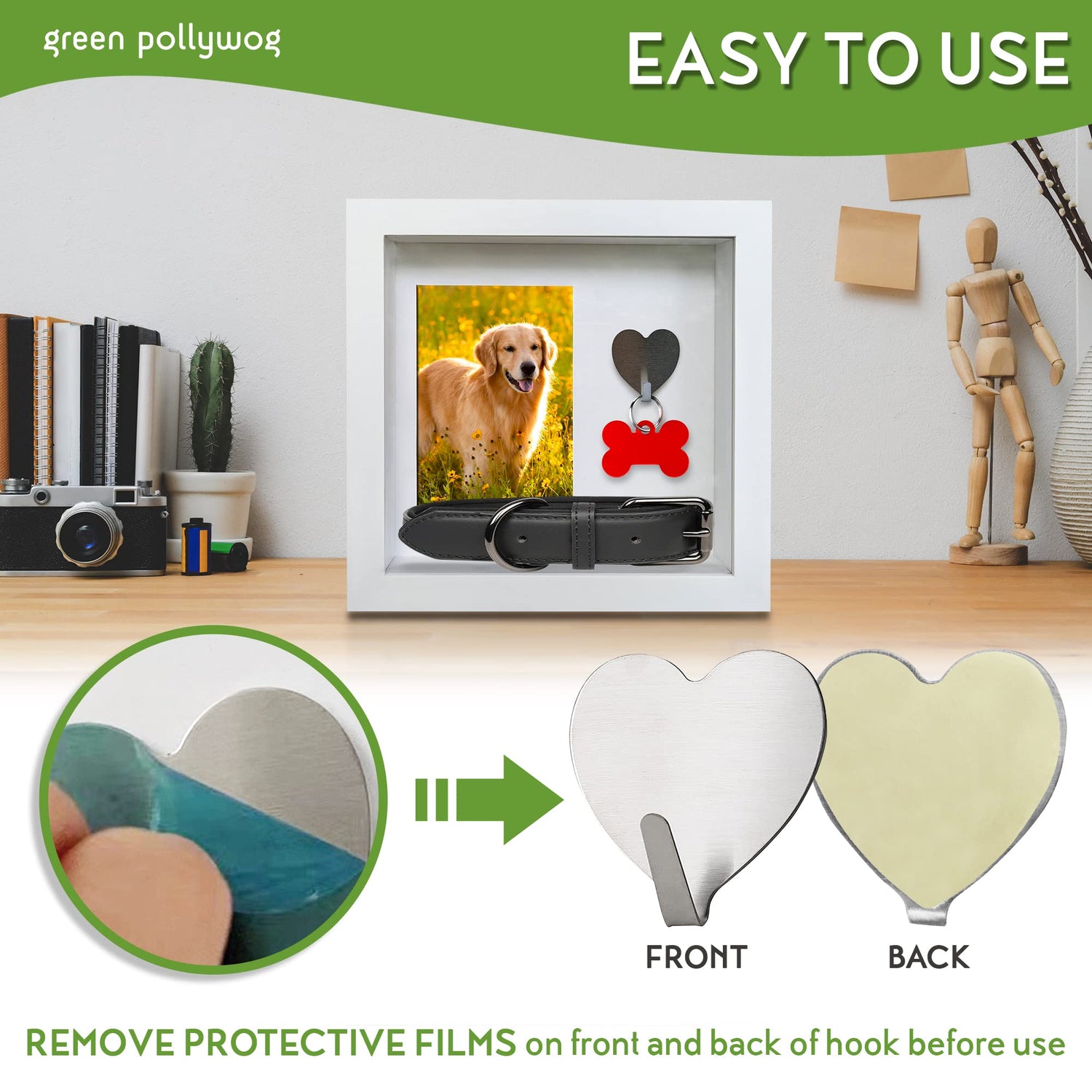 - DOG TAG AND COLLAR SHADOWBOX – Green Pollywog's Dog Tag, Collar & Photo Shadowbox offers an enduring tribute to your cherished furry companion. Designed to accommodate small, medium, and large collars, this shadowbox allows you to preserve and showcase their beloved accessories alongside their tag and photo. Commemorate the life and memories of your pet, even after they've crossed the rainbow bridge, with this special memorial shadowbox. The frame dimensions are 10” x 10” x 2.5”, featuring a 4” x 6” picture opening to prominently display your favorite photo of your pet.