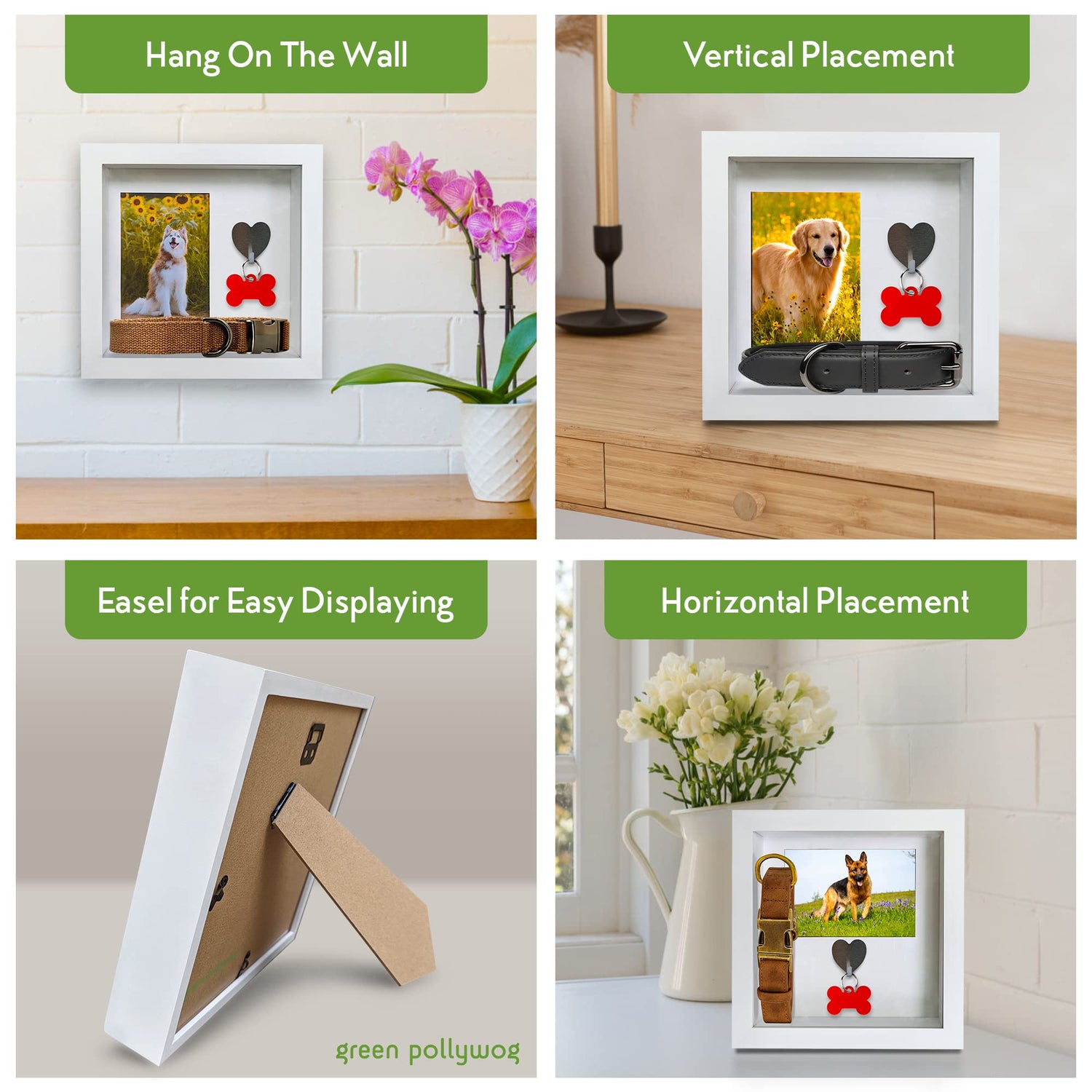 - HANDCRAFTED PINEWOOD FRAME – Green Pollywog’s Dog Tag Keepsake and Picture Frame features a pristine and modern finish that complements a variety of interior décor styles. The hand-finished white pinewood frames bear the mark of artisan craftsmanship, paying homage to your pet in a deserving manner. Constructed with high-quality materials, the frames include museum-grade glass for UV protection, ensuring your cherished photos remain vibrant.