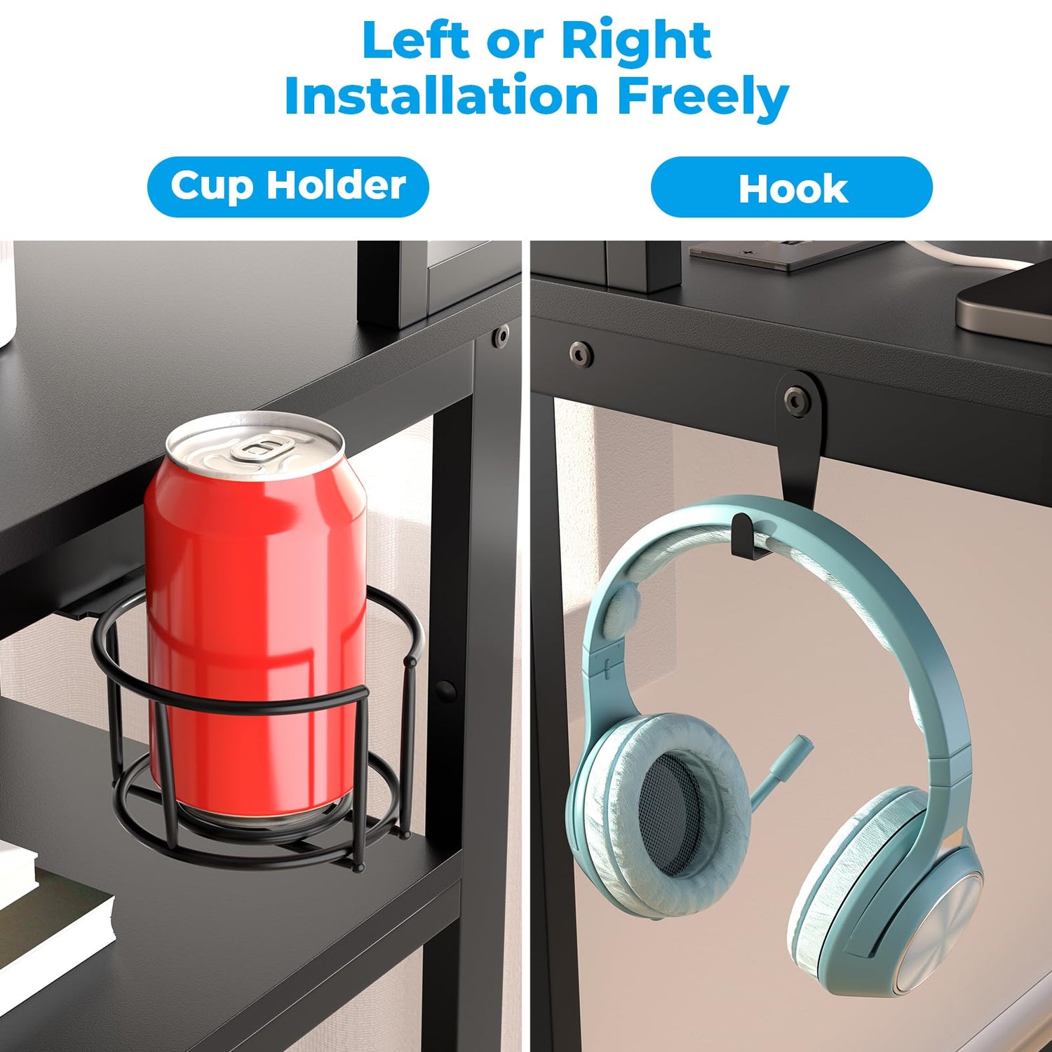 - Space-Saving Design: This computer desk includes a cup holder and a hook, keeping your drinks and headphones within easy reach and making your workspace more convenient and organized