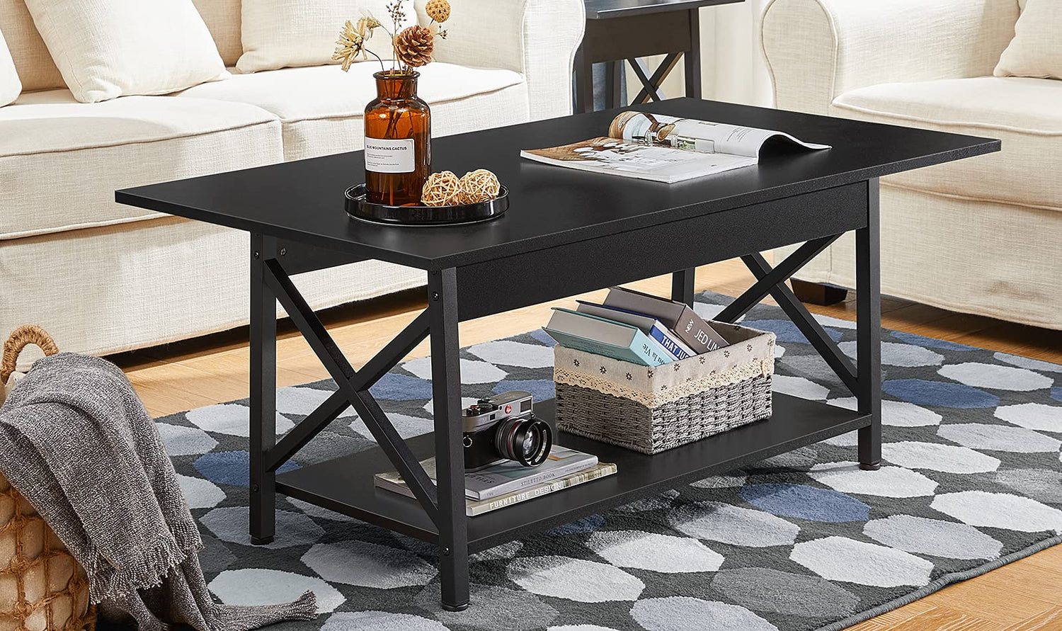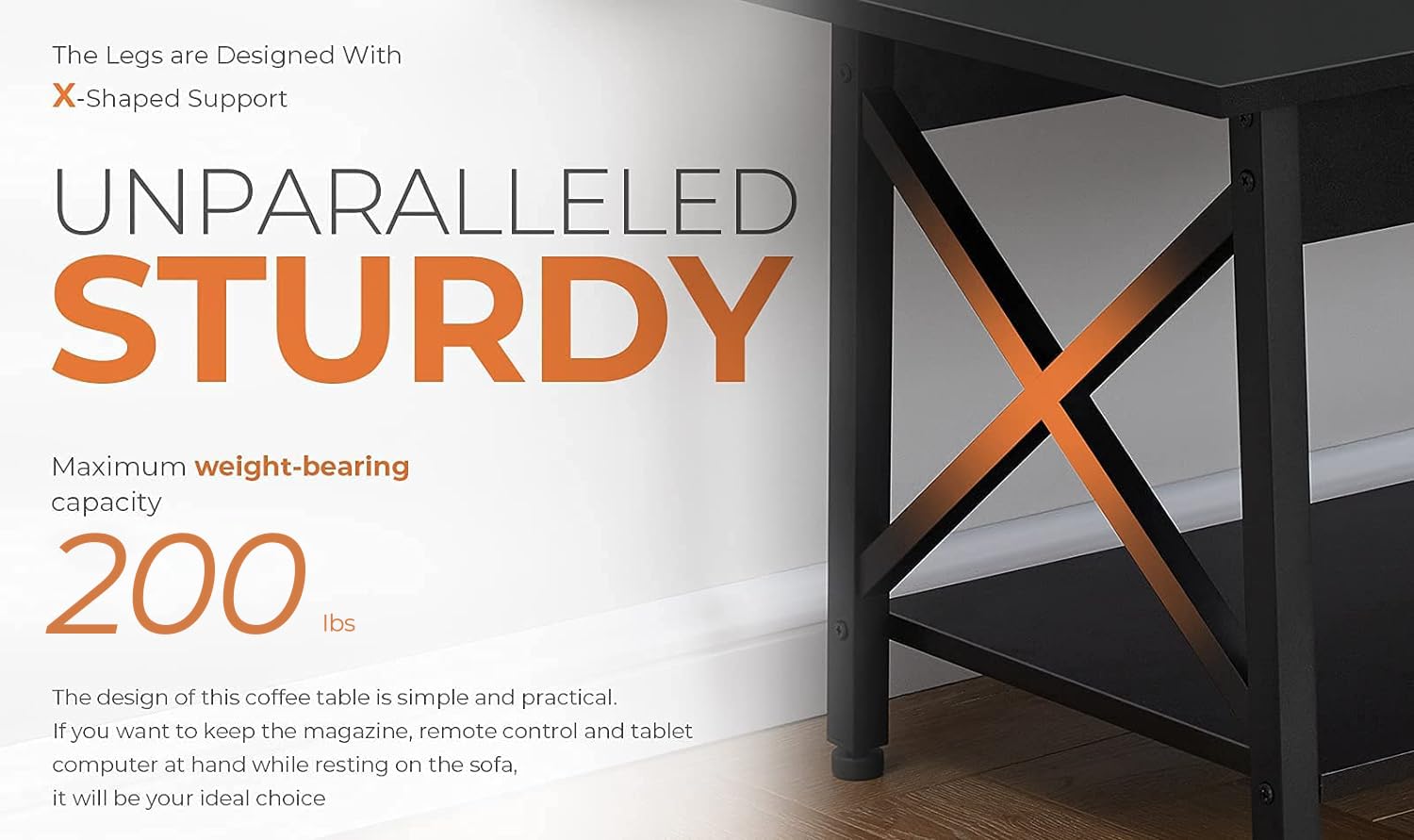 - Sturdy Construction: The coffee tables has extra X-shaped support legs that make the table very sturdy and durable. Its weight capacity is up to 200 pounds. Pre-assembled legs of corrosion-resistant metal galvanized pipe with antiskid rubber protective caps