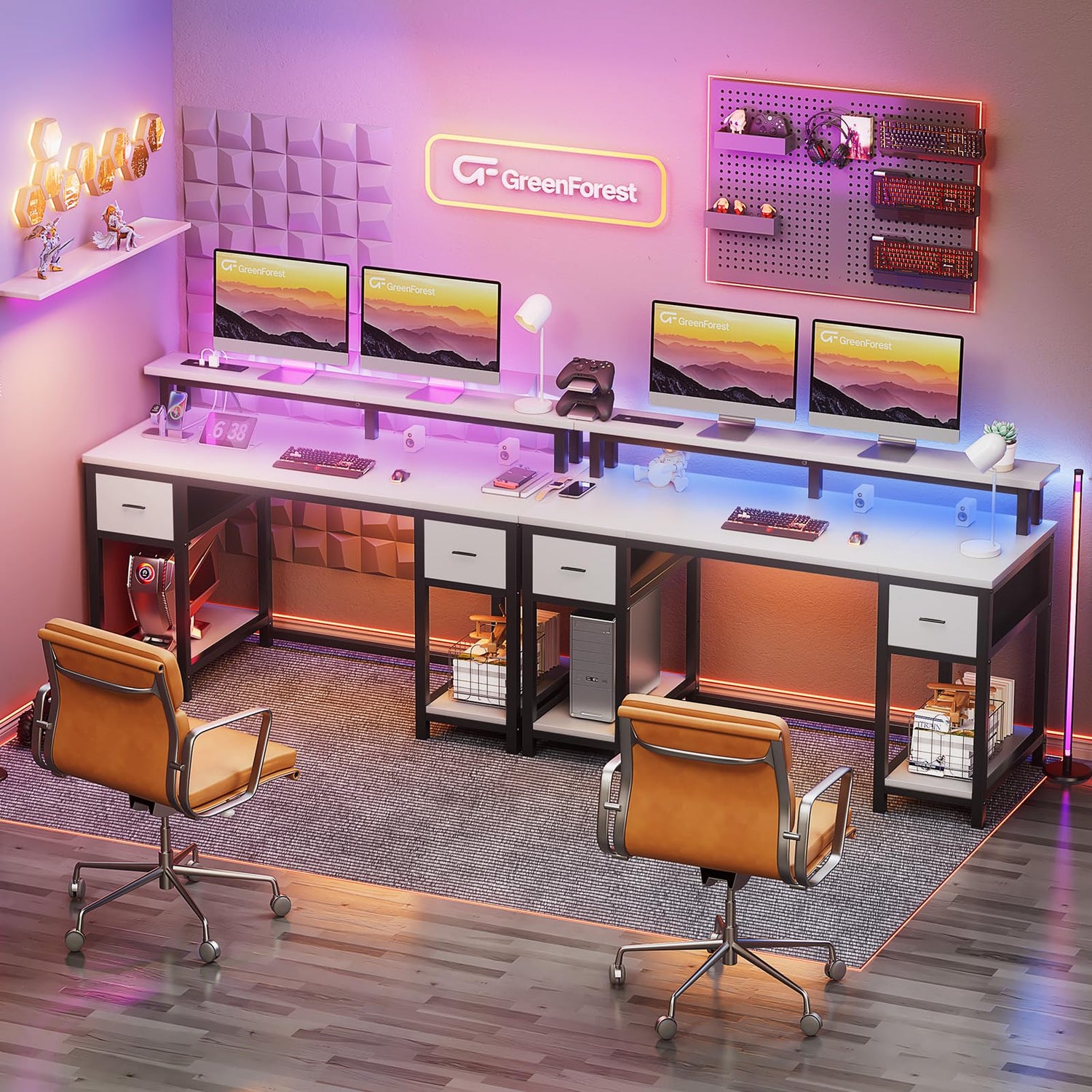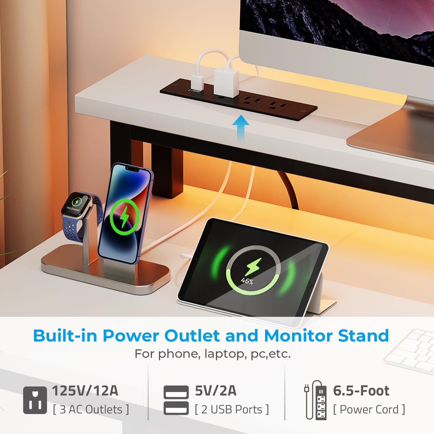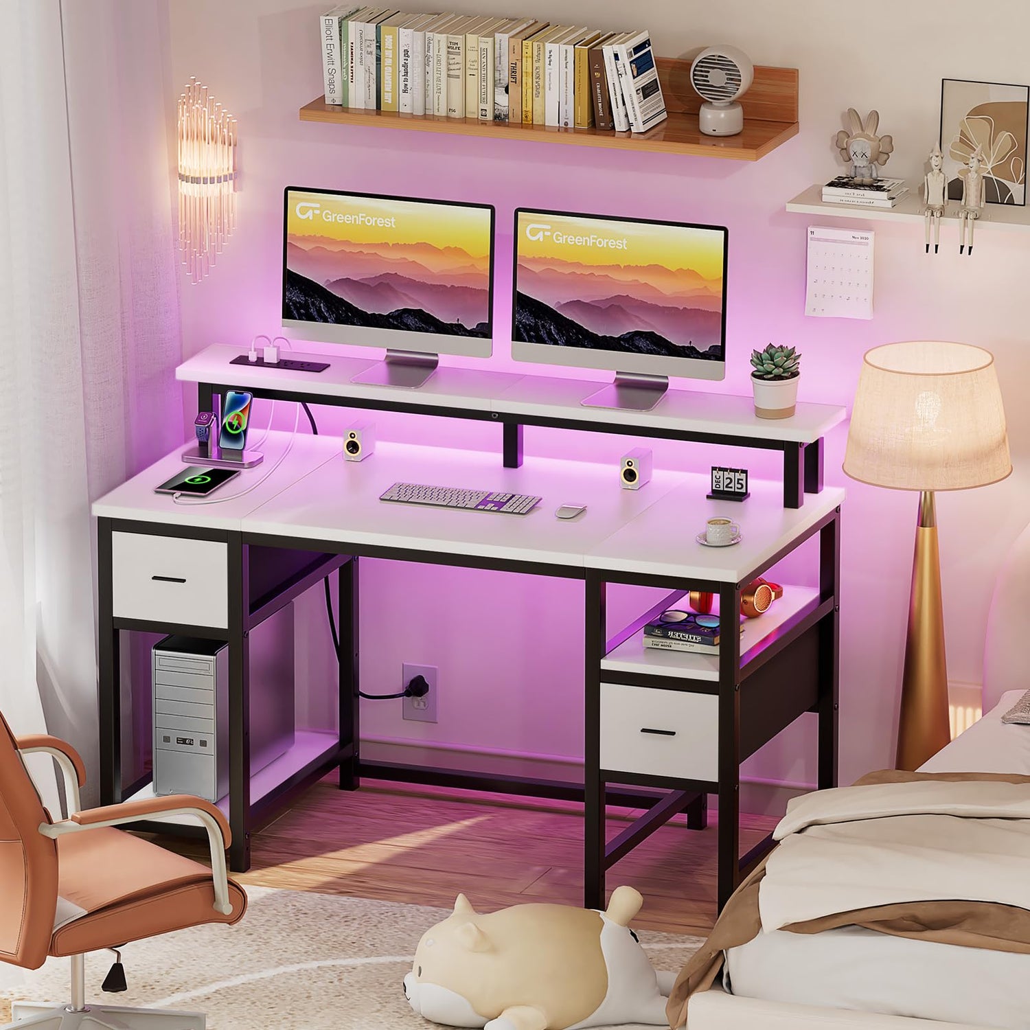 GreenForest Computer Desk 50 Inch with Monitor Stand and LED Lights, Gaming Desk with 2 Fabric Drawers and Power Outlets, Office Desk with Shelves, White
