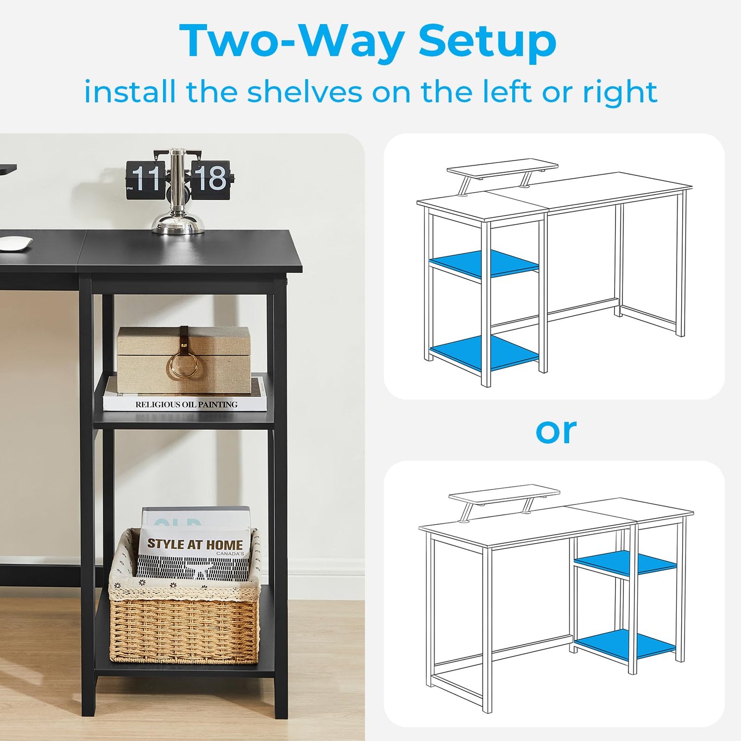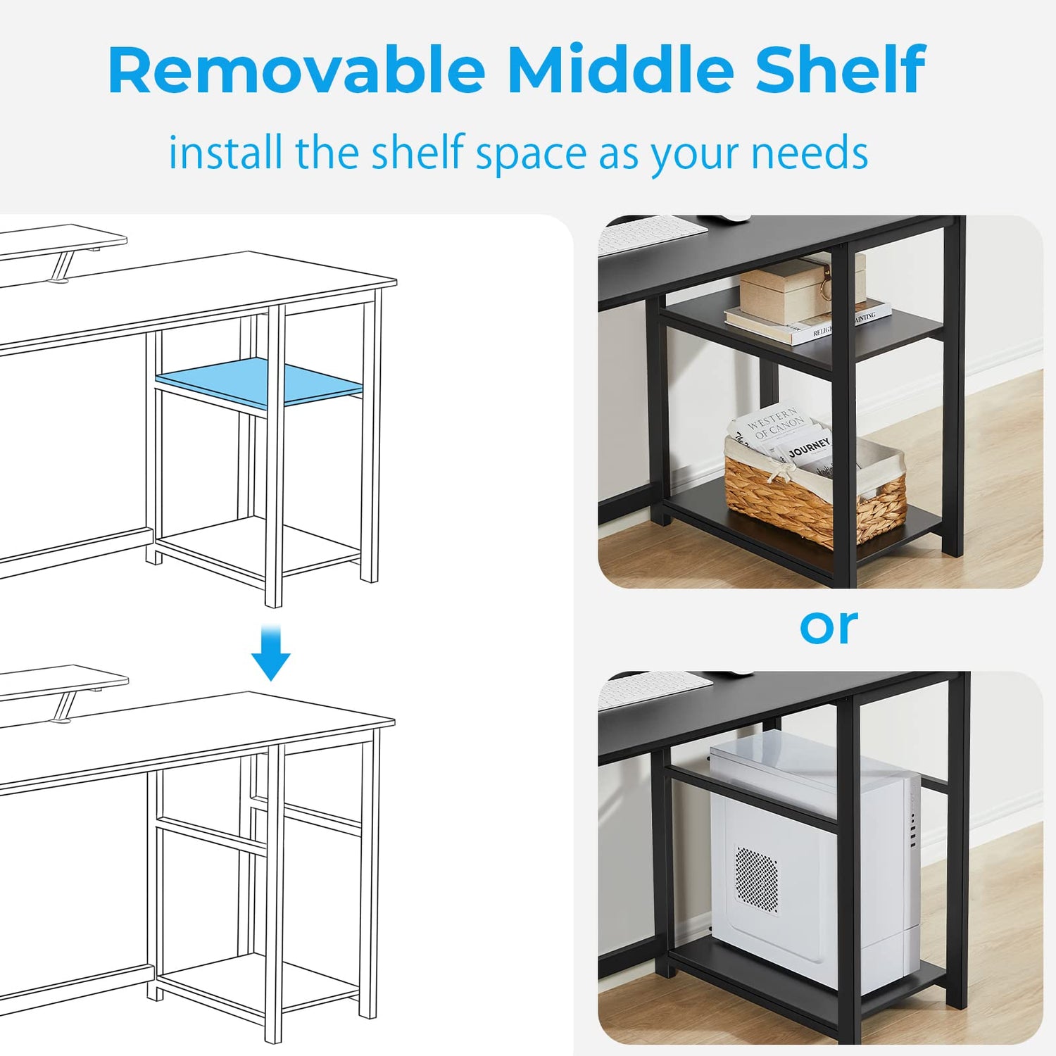 - REVERSIBLE STORAGE SHELVES: Computer desk with 2-tier storage shelves can be installed on left or right side according to your space or use habits.Open shelves can hold your books,storage box etc.You can remove the middle shelf to get more space for large computer tower.