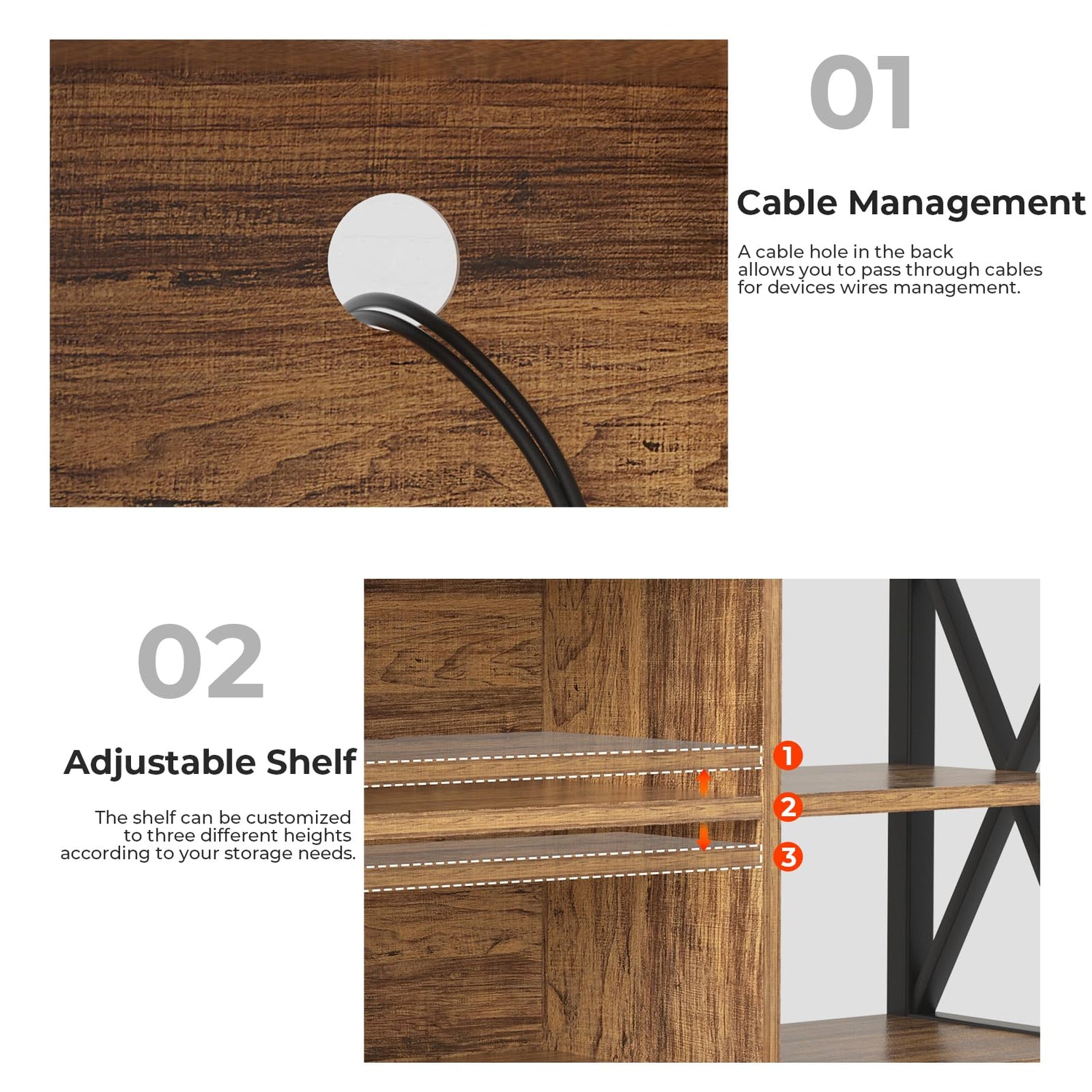 - Adjustable Shelf with Cable Management: This TV stand features an adjustable middle shelf with a cable management hole, allowing you to neatly organize and hide your cables for a clean, clutter-free entertainment center