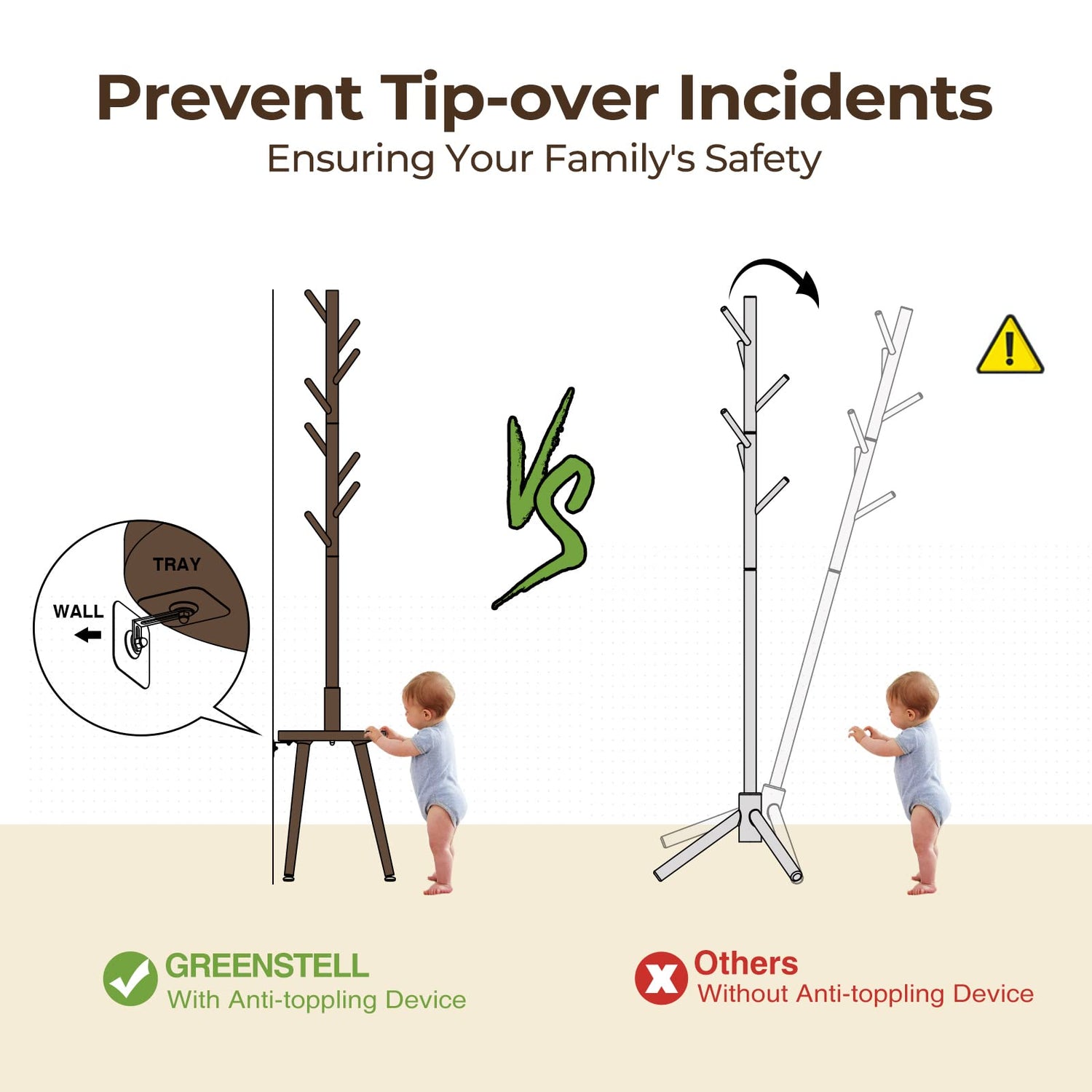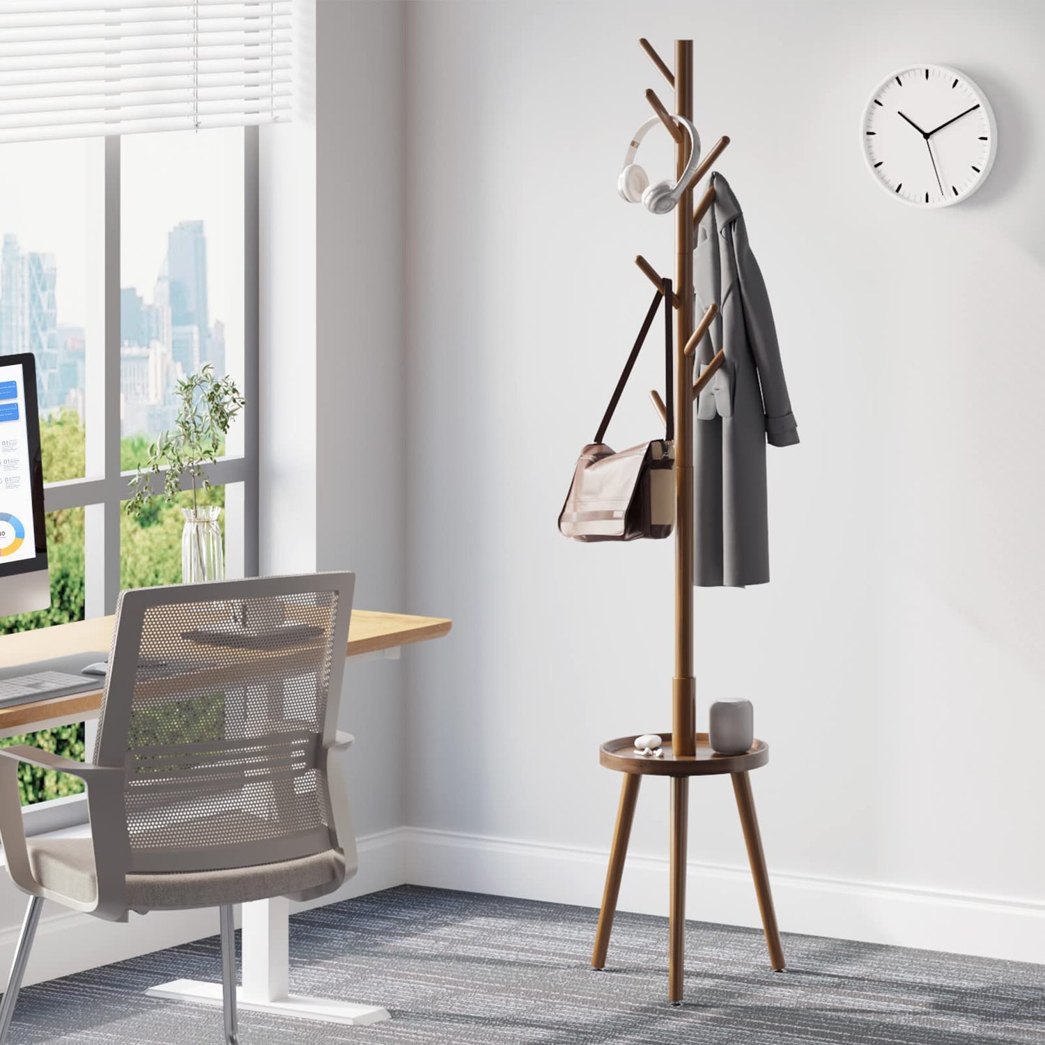 - Coat Tree Free Standing with Shelf & 8 Hook---Multifunctional Storage: Greenstell's multi-functional standing coat rack is equipped with a tray with a radius of 13" and 8 hooks. Great for hanging coats, bags and hats, but you can also put your phones , glasses, headphones, keys and other items in our tray, the lip around the tray is designed to protect the items from falling.