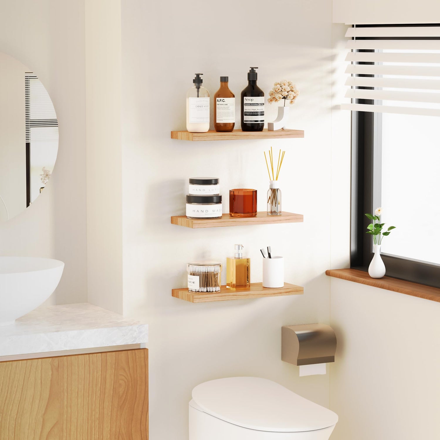 - ✅【Farmhouse Vibe Design】Our floating shelves are designed with farmhouse vibe. It has streamlined look to bring modern style and vintage atmosphere to the home. Our bathroom floating shelves for wall is a set of 3 wall mounted shelves. Our rustic shelves can give us plenty of space for creativity, we can choose a line, a ladder shape, or a symmetric way. Let our bathroom shelves floating shelf more suitable to the home decor and bring a better visual experience.