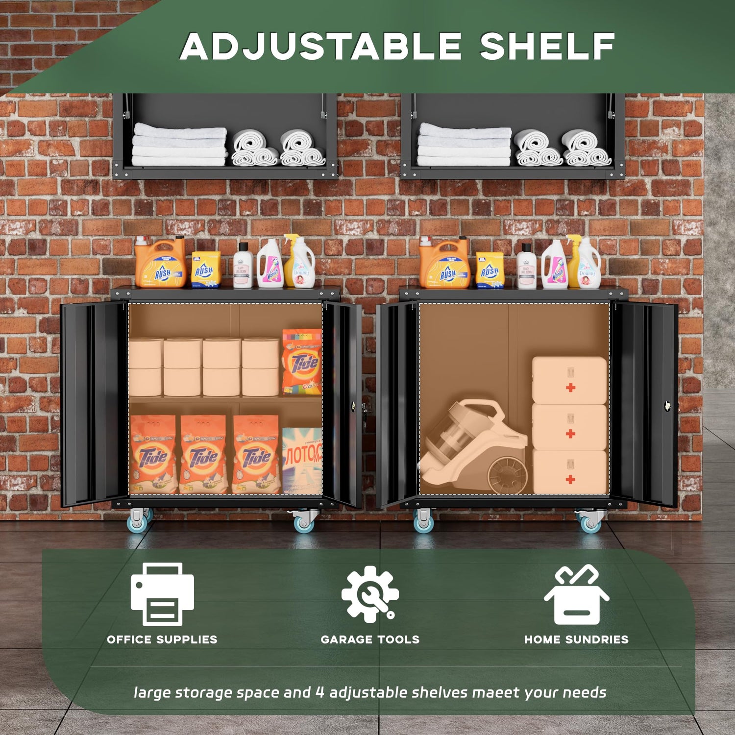 - 【Large Capacity】:Greenvelly 36*32*16 inch black metal storage cabinet on wheels has a Large capacity to store your belongings. Equipped with locking doors and adjustable Shelf. Garage steel cabinet the good choice to keep your personal items and documents safe in any garage, home, office, utility room, laundry room.
