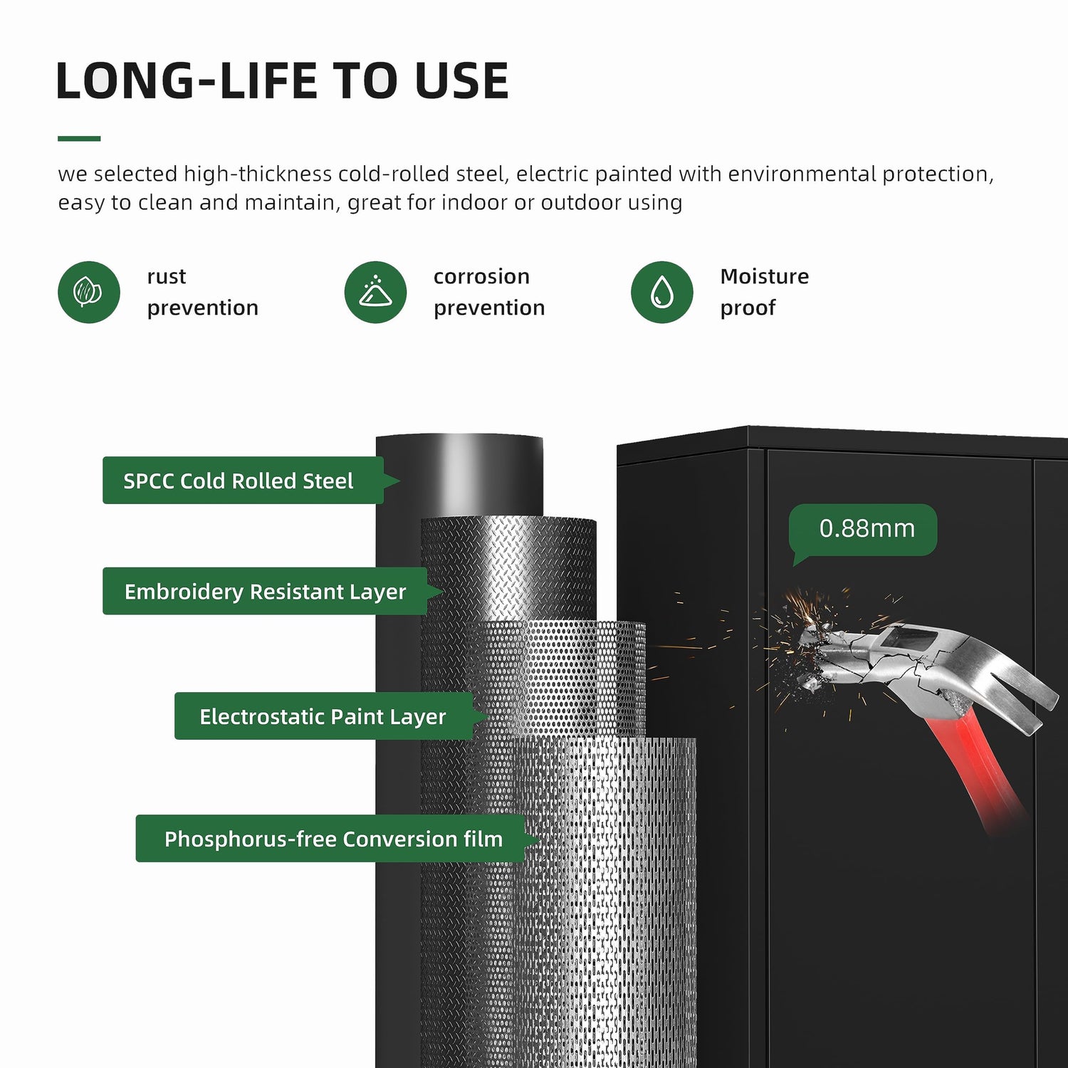 - 【Humanity Design】Greenvelly series metal storage cabinets use adjustable shelves to adjust the height of different compartments according to the size of the items being stored. The sturdy material is not easily deformed, and its load-bearing capacity is ahead of most metal cabinets of the same model. The black exterior design is very modern, fashionable, and practical. Utility metal storage cabinet allows you to easily store various files and tools. It is absolutely safe to use!