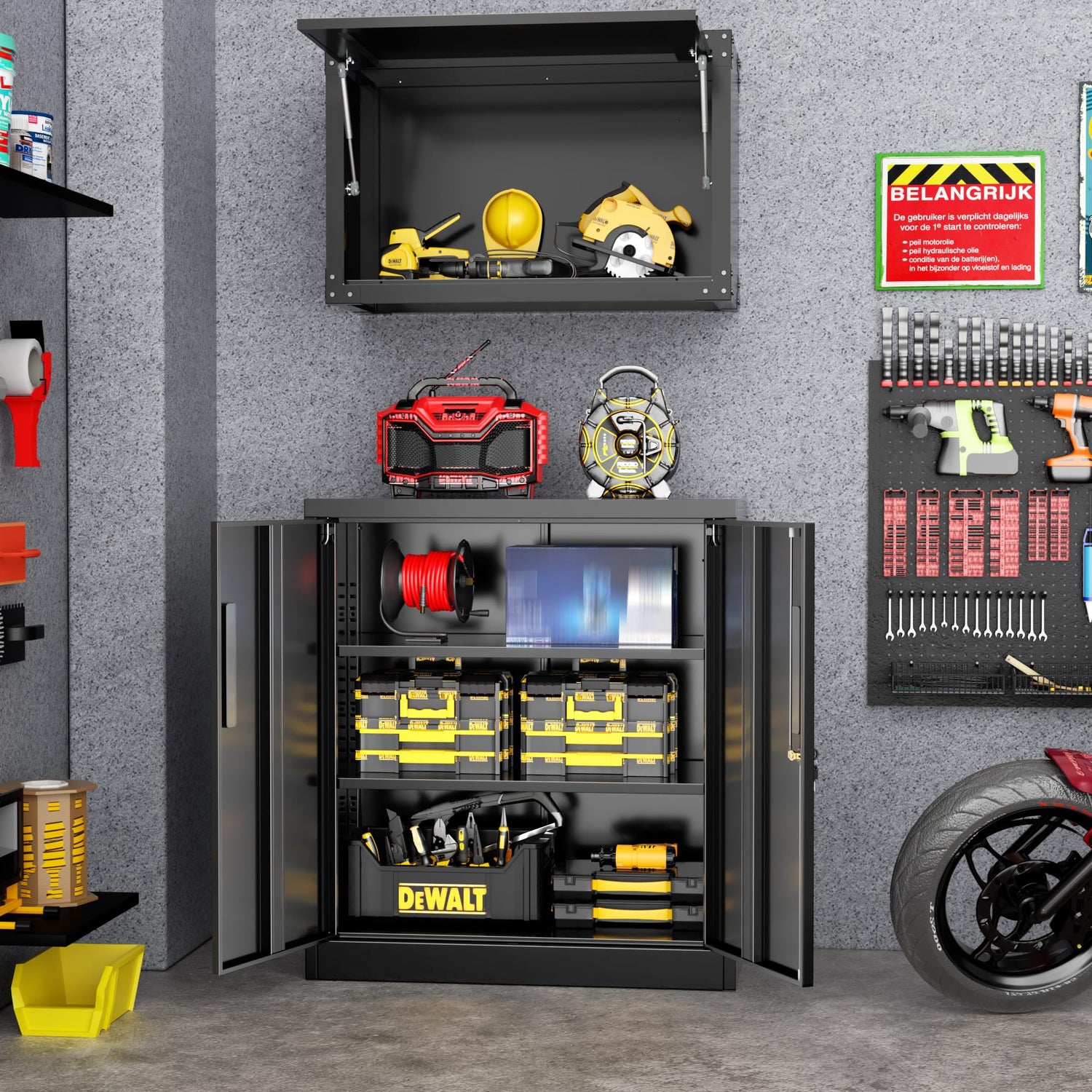 - 【Heavy duty cabinet】: Greenvelly large metal storage cabinets are made of high quality cold rolled steel with steel plate, which is stronger and more durable than other cabinets. The garage torage system uses new imported paint, which is scratch and wear resistant, extending the use of the cabinet and easy to keep clean.