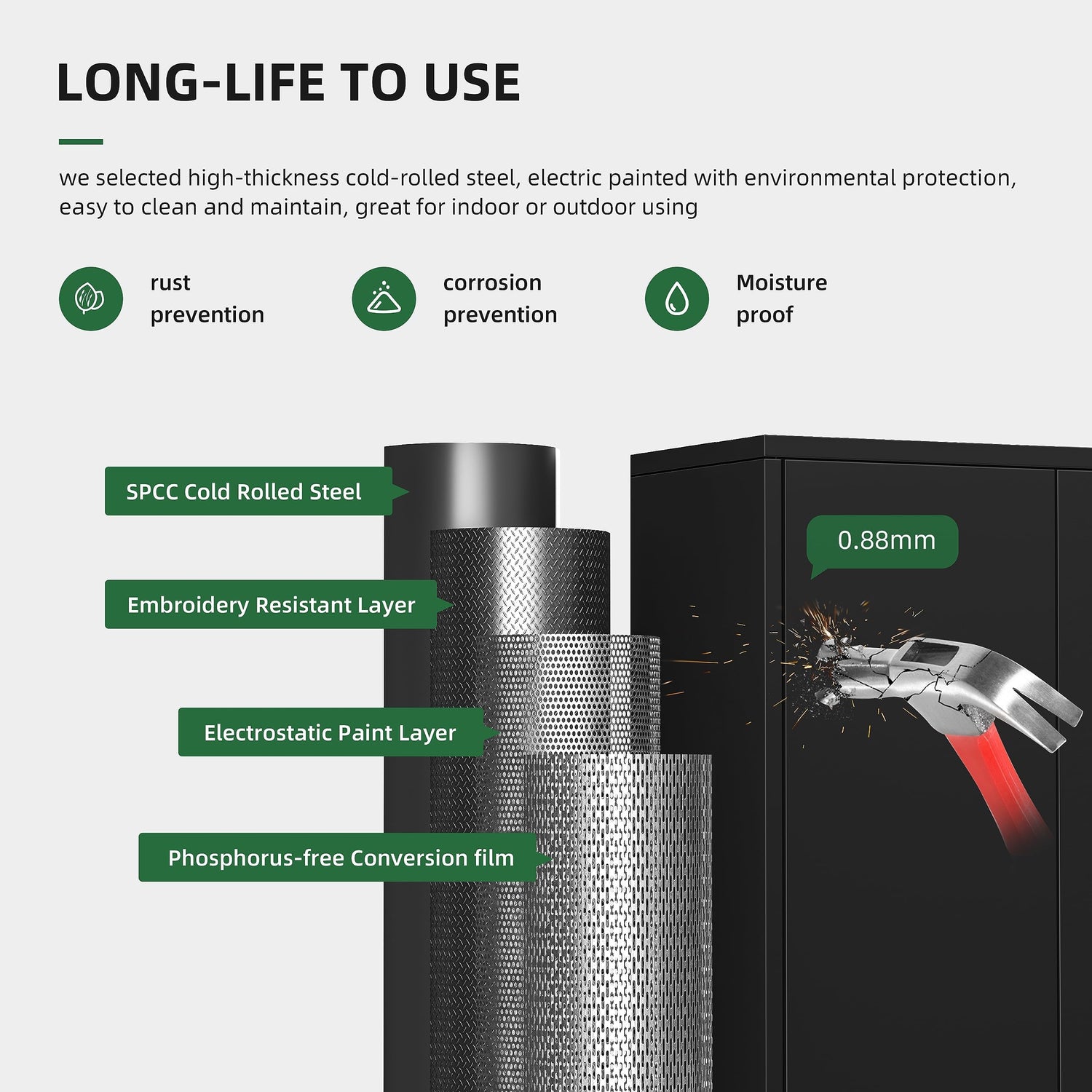 - 【Robust & High-Quality Coating】Compared to ordinary wooden or plastic cabinets, GreenVelly black metal cabinet is made of high-quality cold-rolled steel with a thickness of just 8mm, ensuring strength and durability. The surface of the metal cabinet is coated with a waterproof and rust-resistant coating, which is corrosion-resistant and odorless, adaptable to both dry and humid environments, making it convenient for daily cleaning and long-term storage.