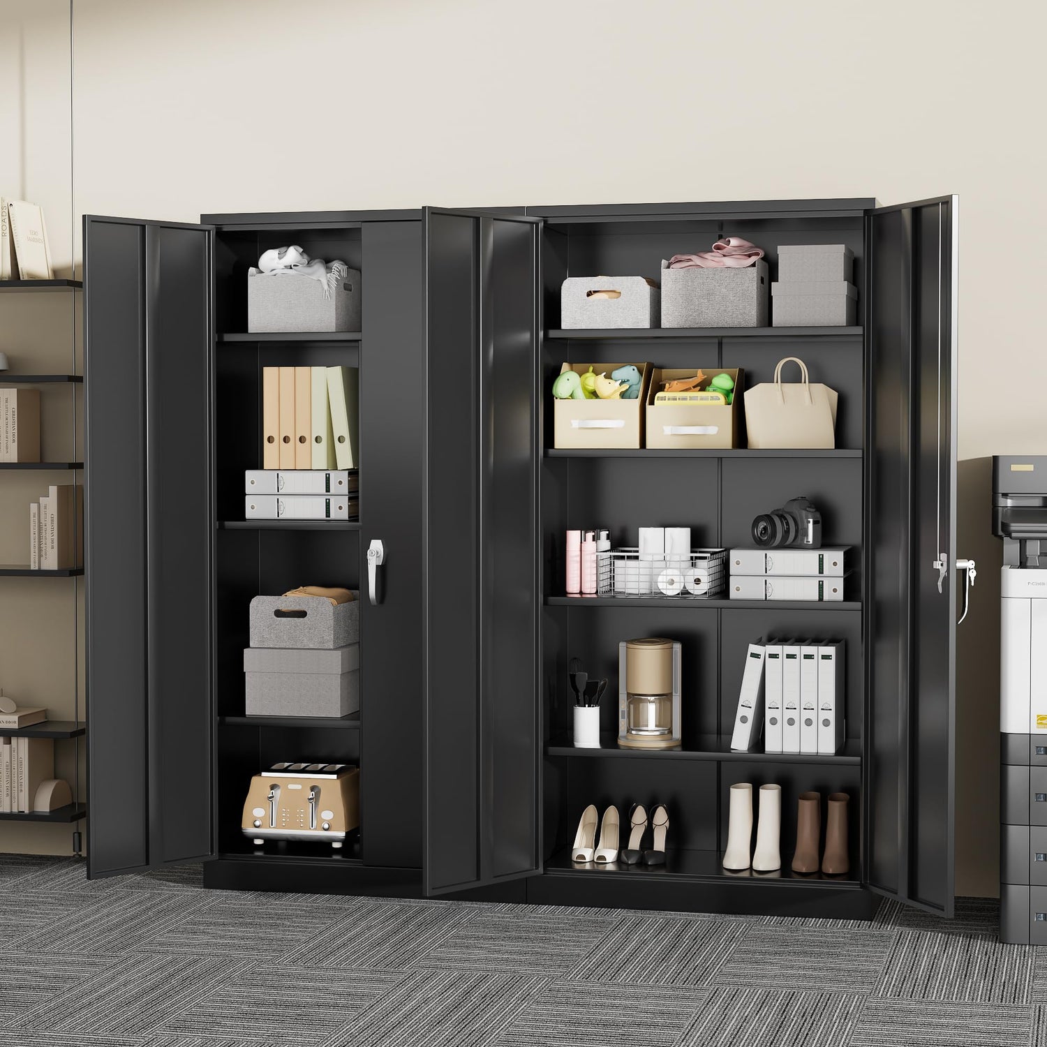 - 【 High end Manufacturing 】 Greenvelly heavy-duty metal storage cabinets with lock are made of high-end cold rolled steel, paired with a 0.8mm thick thin layer technology to reduce floor space. Lockable metal storage cabinets provide more space for use. The tool metal cabinet also adopts a nanoscale high-quality coating, which is scratch resistant, wear-resistant, dirt resistant, and easy to clean. Safe and reliable choice for black metal cabinets.