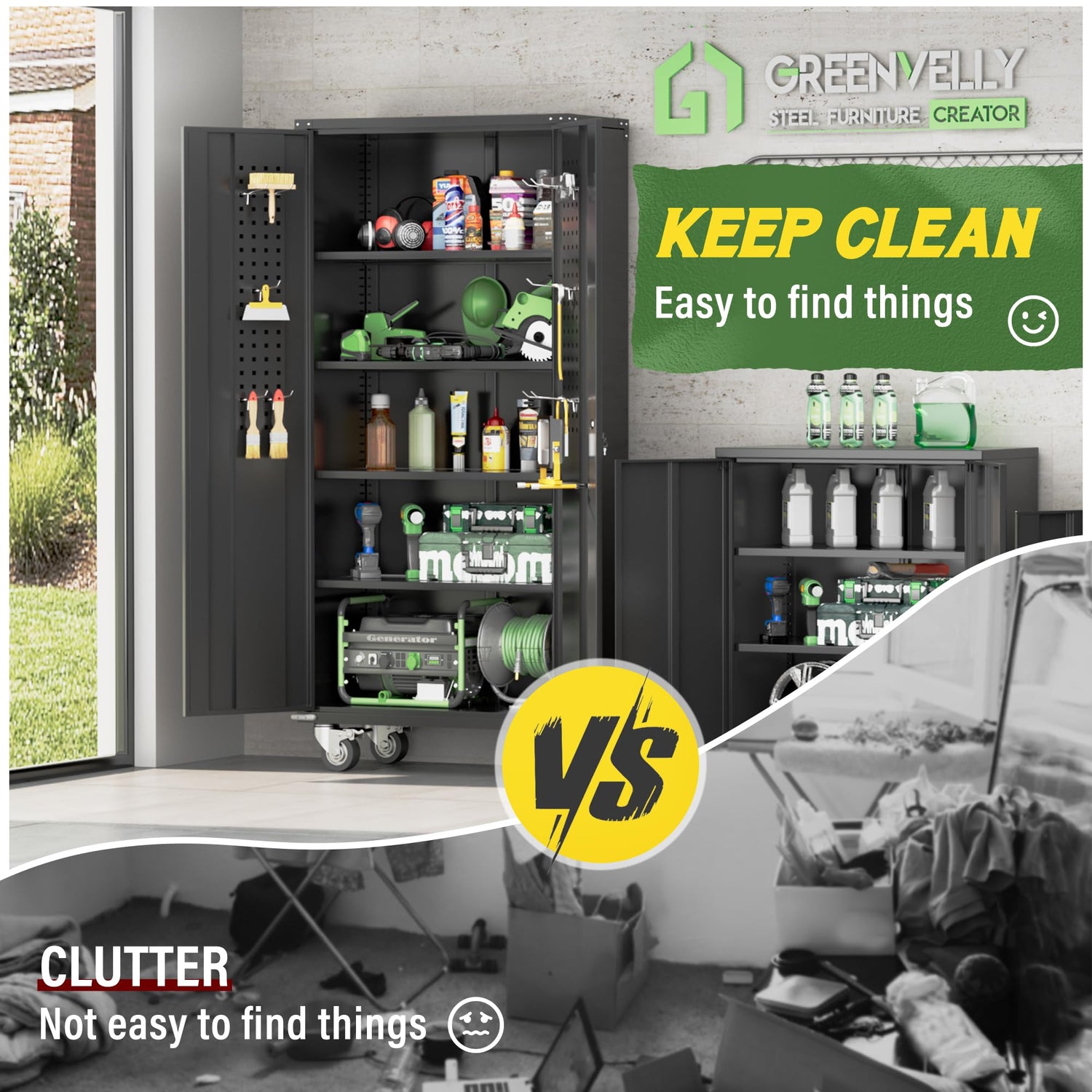 - 【Innovative Storage Space】Greenvelly 72-inch Garage storage cabinet with wheels, as well as 2 functional pegboards and multiple hooks, all carefully designed to ingeniously expand the storage space. Metal storage cabinet with lock is superbly suited for organizing kitchenware, garage tools, and files, standing out as an outstanding choice for efficient storage.