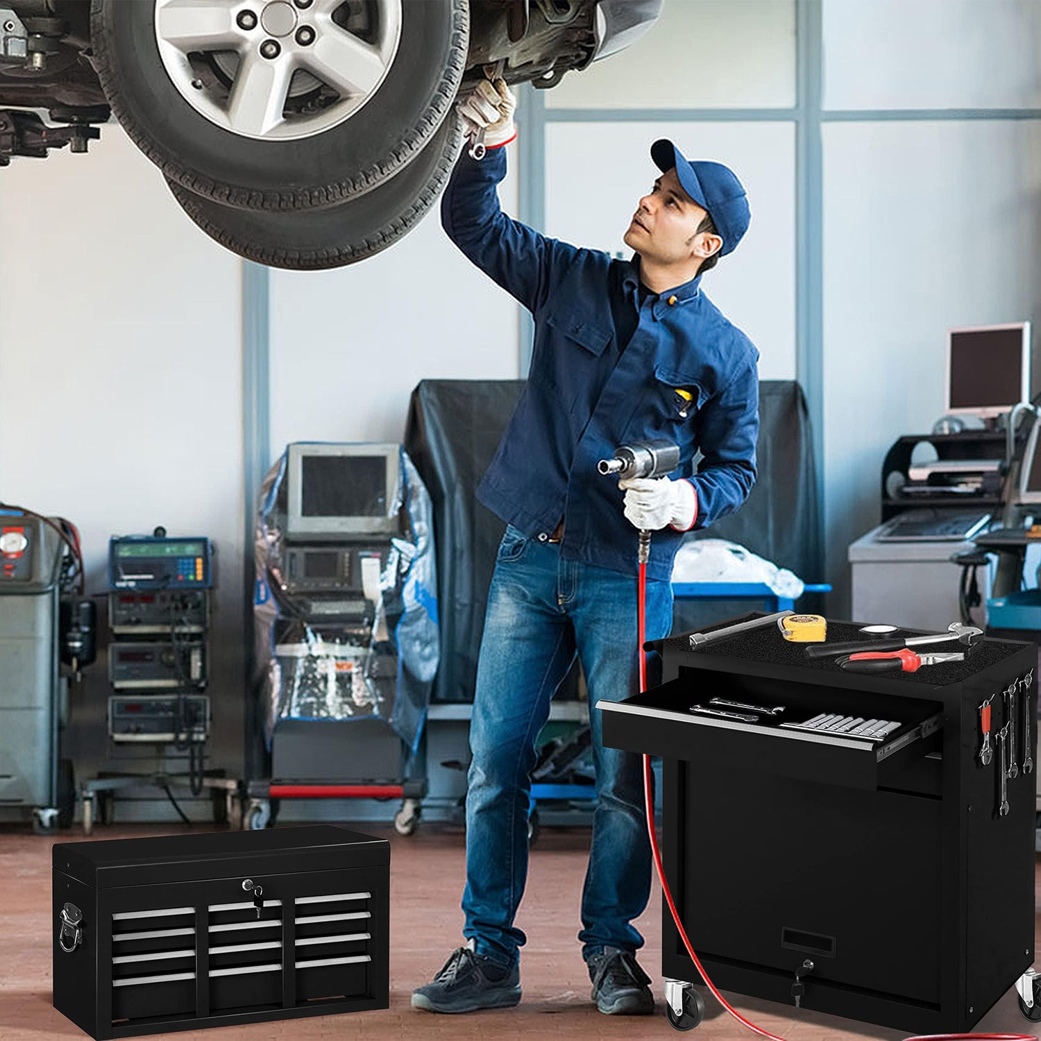 - [Large Storage Capacity]: Greenvelly detachable tool chest with 2-In-1 Design. It is composed of an upper tool cabinet and a Bottom rolling tool cabinet.The upper tool cabinet consists of 3 medium & 3 small drawers and a top cover,and the Bottom rolling cabinet has a 2 large drawers and a cabinet with lock door. The upper tool cabinet could put into the cabinet of the bottom rolling tool chest .In addition, the side is equipped with 6hooks that could be moved and removed.Multiple storage Spaces for tools of all sizes.