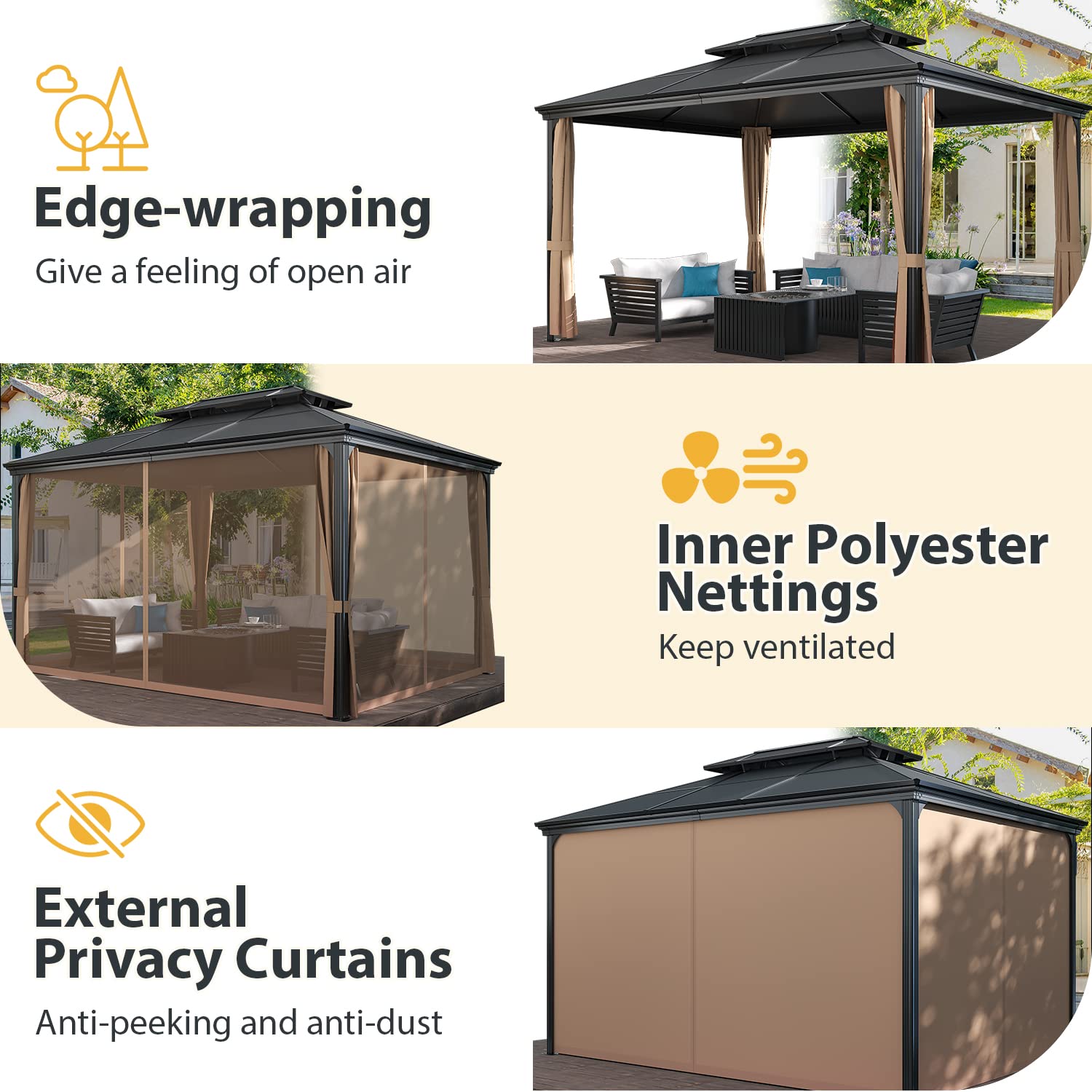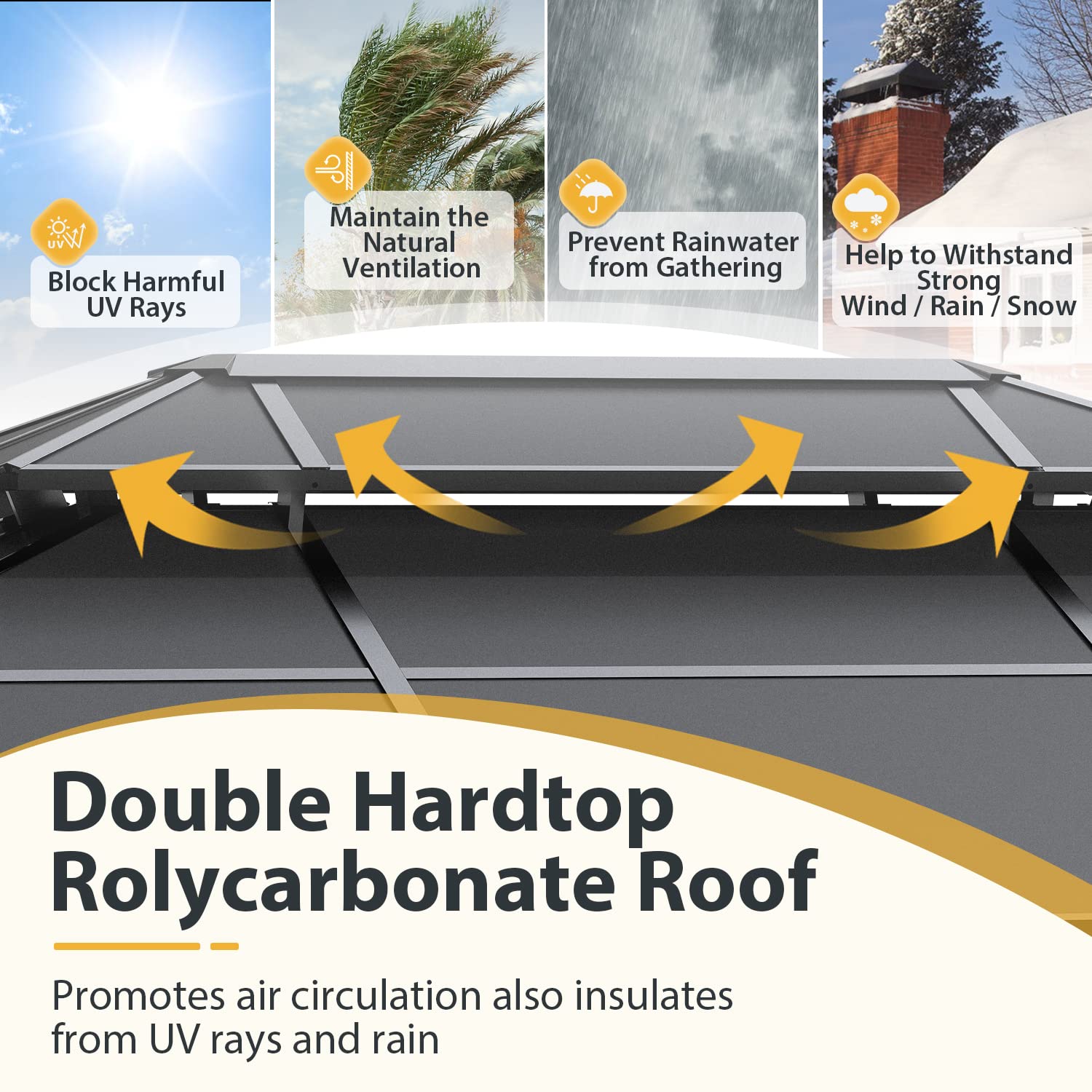 Details: Greesum 10'x13' Hardtop Polycarbonate Gazebo,with Netting and Curtains for Patio, Backyard, Deck and Lawns