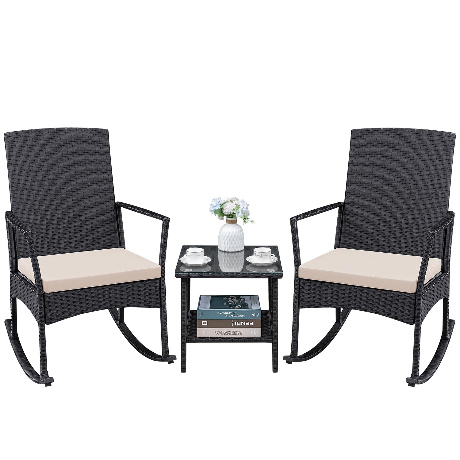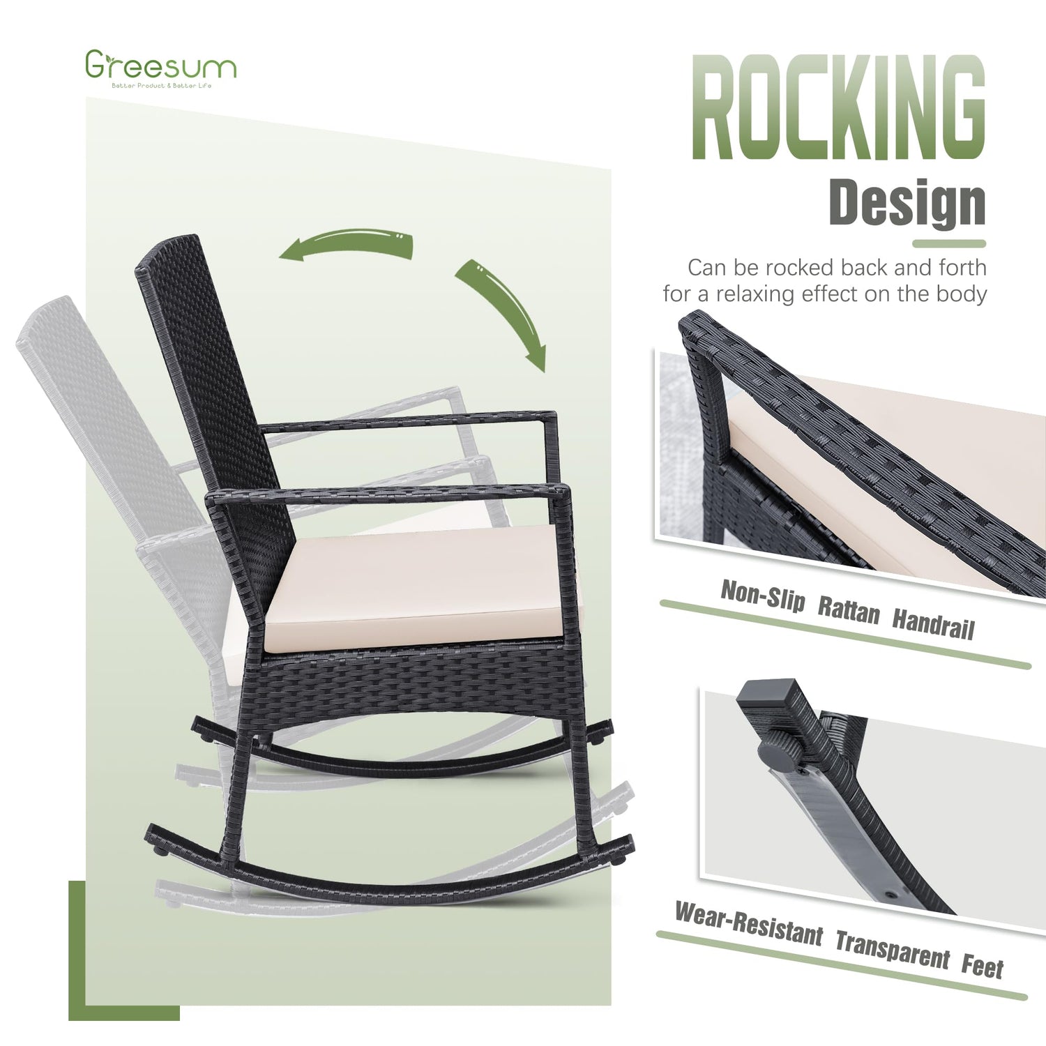 Details: Greesum 3 Pieces Patio Furniture Set Outdoor Wicker Rocking Chairs with Glass Coffee Table