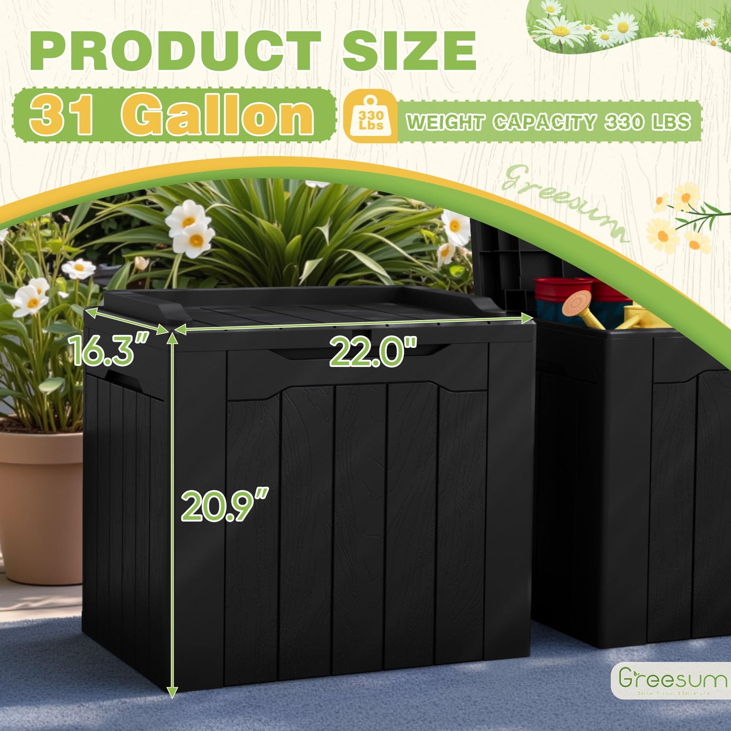 Greesum 31 Gallon Deck Box for Outside, All Weather Outdoor Storage Boxes for Patio Furniture Set, Package Delivery Box, Garden Tools, Black(Set of 2)