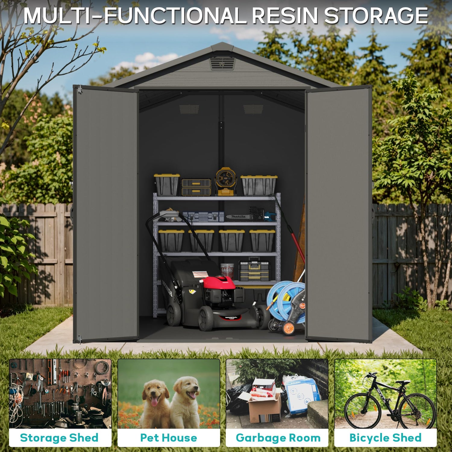 Greesum 6×10FT Plastic Outdoor Storage Shed with Floor, Resin Storaged Sheds with Lockable Double Door, Windows & Vents, All-Weather Tool Sheds for Garden, Backyard, Patio, Dark Gray