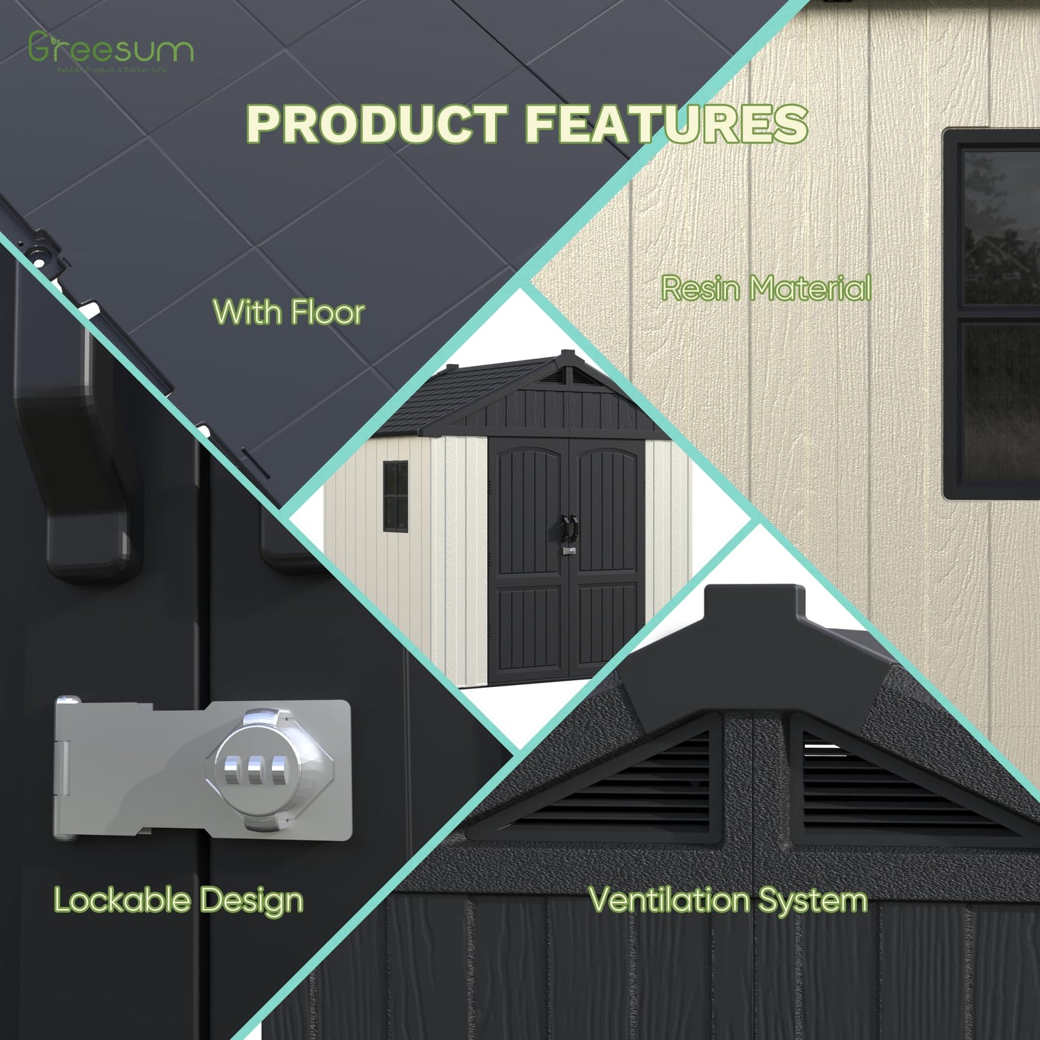 Details: Greesum 8×6 FT Plastic Outdoor Storage Shed with Floor, Resin Sheds with Window and Lockable Door, Weather Resistant Organization for Garden, Lawn, Pool Supplies, Beige