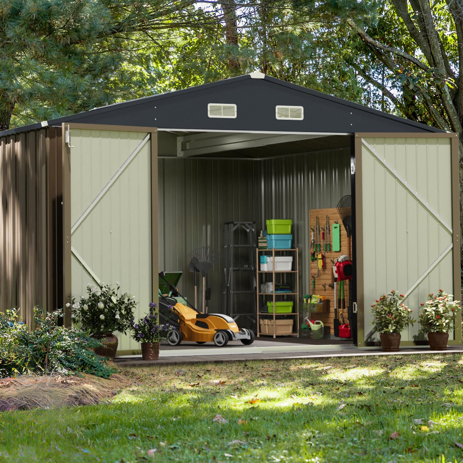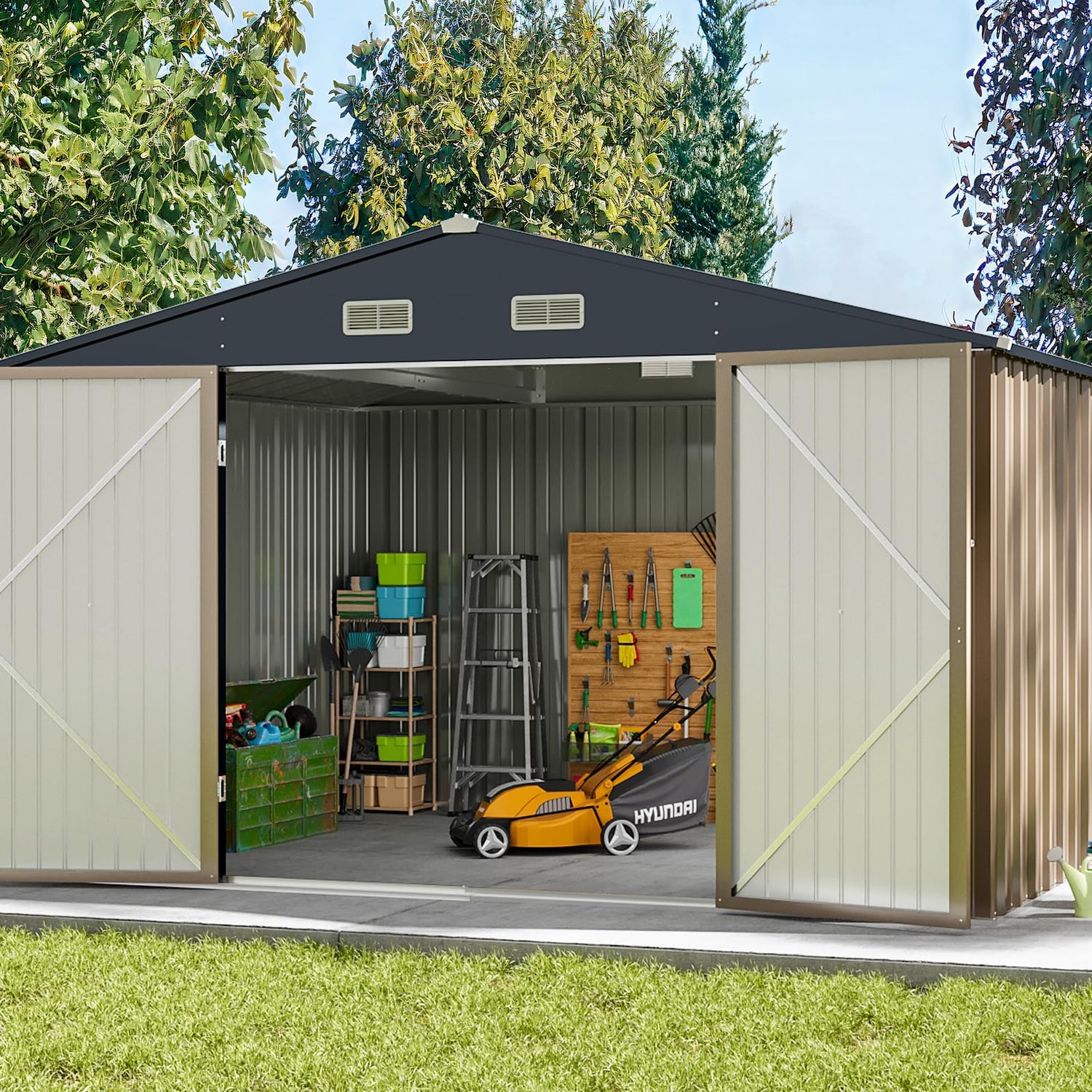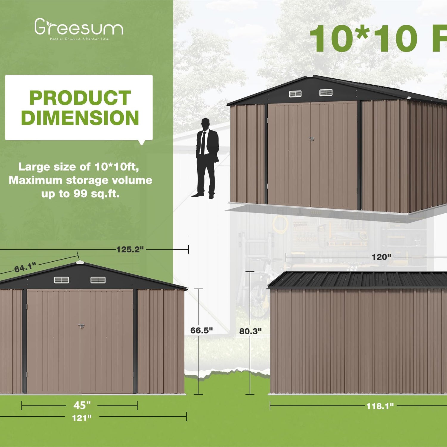 Greesum Metal Outdoor Storage Shed 10FT x 10FT, Steel Utility Tool Shed Storage House with Door & Lock, Metal Sheds Outdoor Storage for Backyard Garden Patio Lawn (10' x 10'), Brown