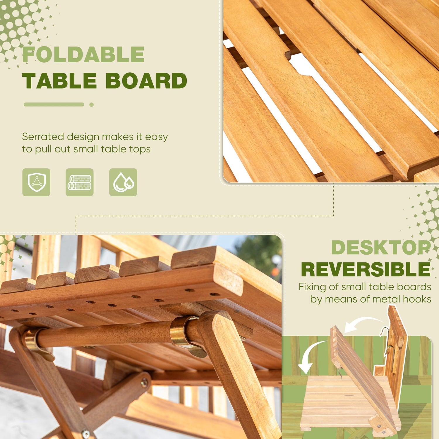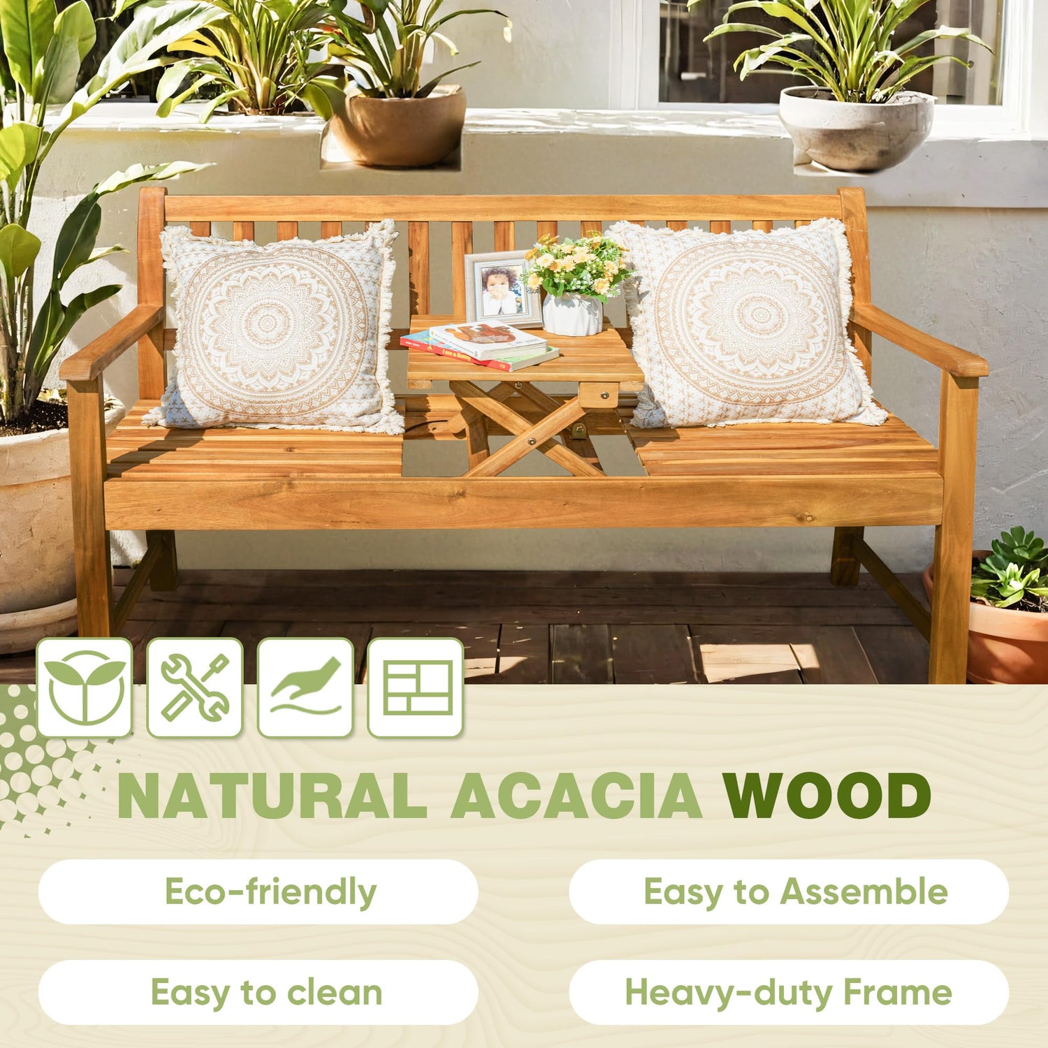 Details: Greesum Acacia Outdoor Bench, 2-Person Patio Loveseat Furniture w/Foldable Small Table Plate