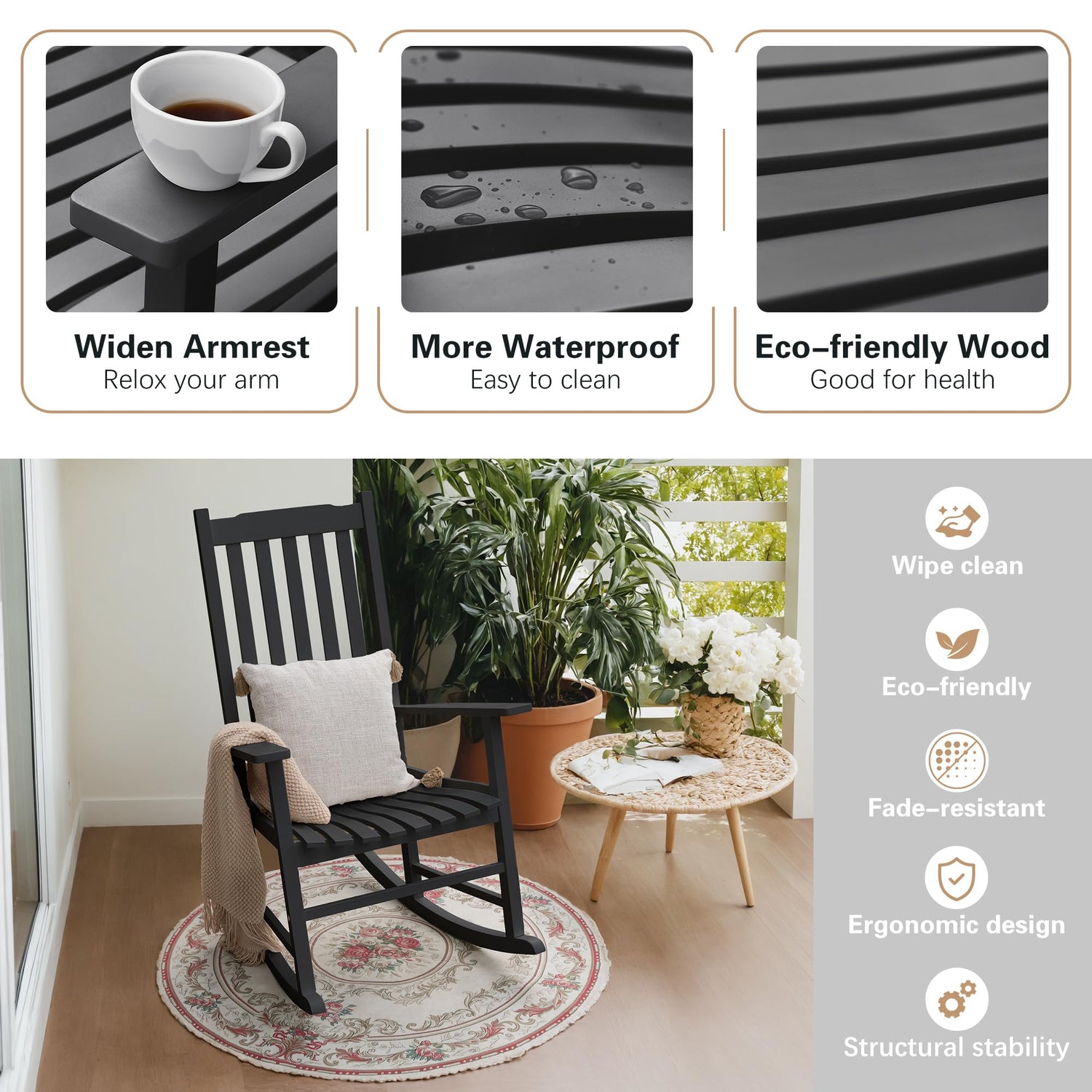 - ANTI-ROLL DESIGN FOR MORE SAFETY: Never worry about rolling, rocking chair has 3 support points with crossbars, and the rocking chair rocking fittings we extended the back swing, can effortlessly support your weight to ensure your safety.
