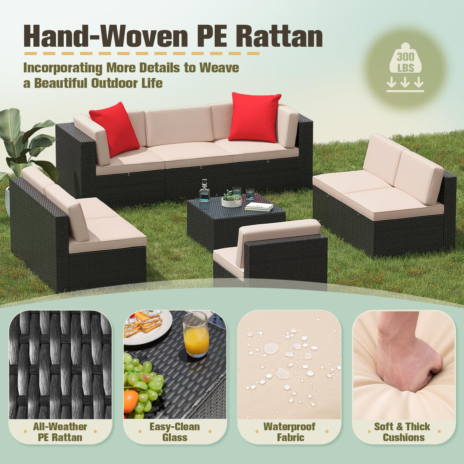 - Patio furniture set: The 9 piece wicker patio furniture set is easy to set up and made from high quality synthetic handmade rattan. The set includes 6 Armless sofa, 2 corner sofas,1 tempered glass coffee tables. And all the necessary tools and detailed instructions are in the box.