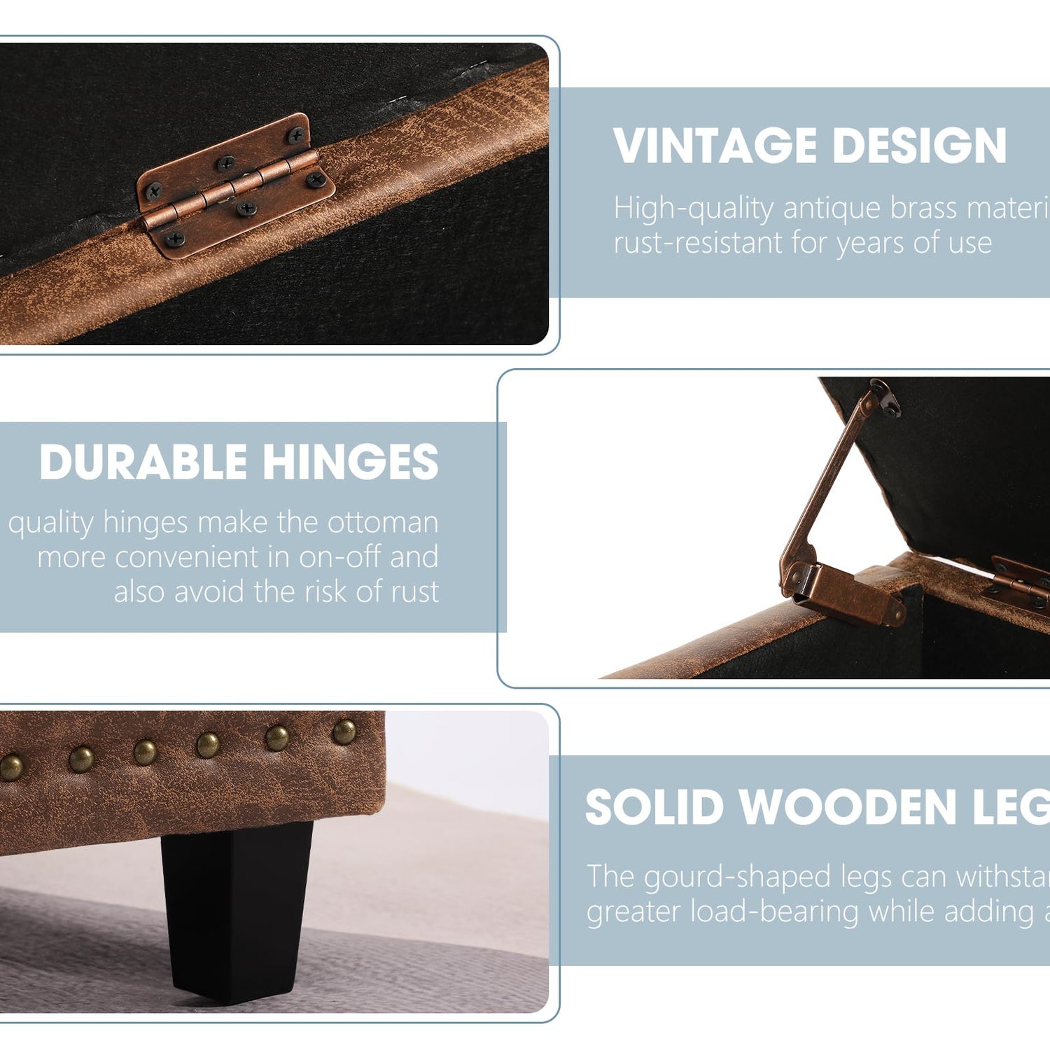 - Superior Quality: Crafted with a sturdy solid wood frame and durable wooden legs, our ottoman storage bench is built to last. It has a static load capacity of up to 660 lbs., ensuring durability and stability. The interior is equipped with safety pressure hinges and sturdy hardware, keeping the lid open securely.