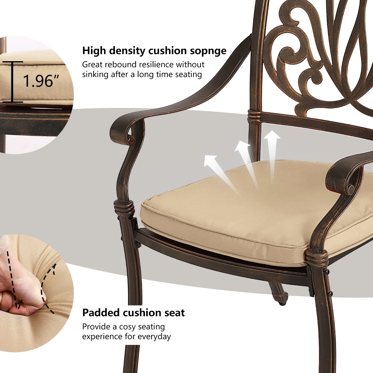 - Comfort Removable Cushions: Each patio chair comes with a removable cushion that is UV treated and fade-resistant. The zippers make it easy to remove and hand wash. Whether you're sitting for a short break or enjoying a long meal, the curved armrests and well-ventilated seats ensure maximum comfort. Even without the cushions, the chairs can be used normally, providing you with versatility