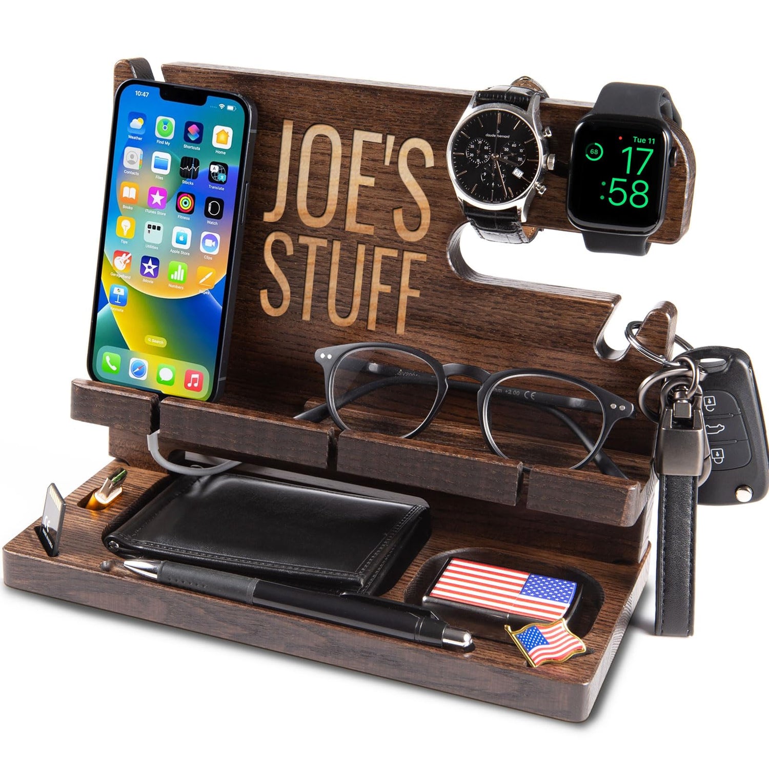 GRETAOTO Personalized Wood Docking Station for Cell Phone, Tablet, Wallet, Watch, Keys, Desk Nightstand Organizer, Valentines Day, Gifts for Men (Deep Brown)