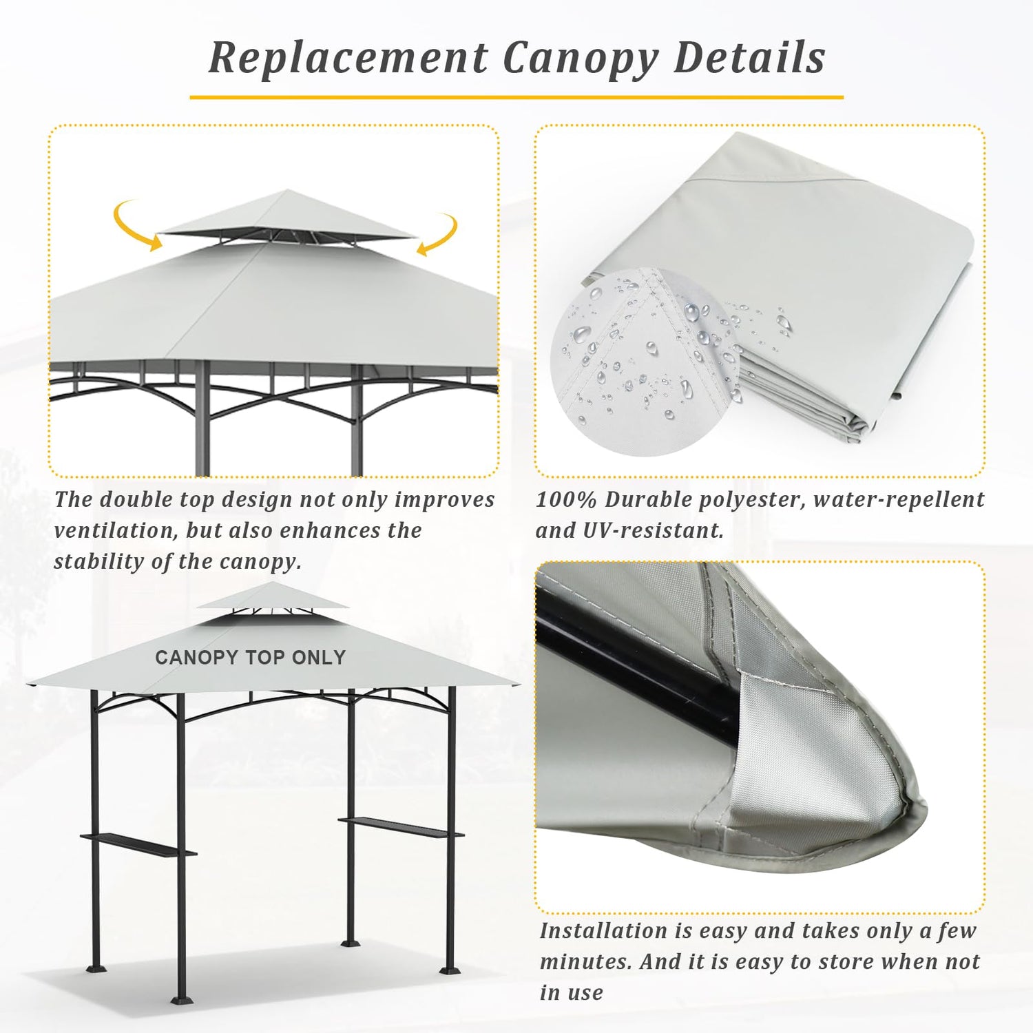 - Attention: Package includes replacement canopy cover ONLY, the metal structure and others are not included. Please confirm the model of the Grill Gazebo before placing your order