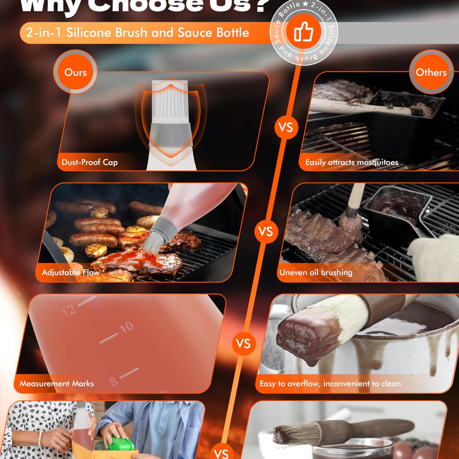 - Innovative Design for Effortless Cooking:All-in-one basting bottle with a built-in brush ensures easy marinating. The large capacity reduces the need for frequent refills.