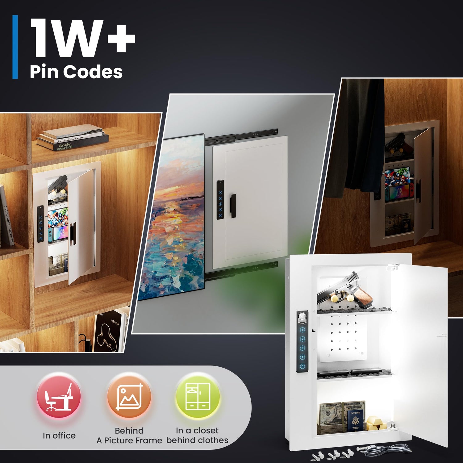 - 【Sturdy Anti-Theft Design In Wall Gun SafeBetween Studs】The closet safe constructed from heavy duty, features PIN code electronic keypad , hidden key hole with 2 keys and a USB emergency charging port for secure access at any time, caja fuerte para dinero
