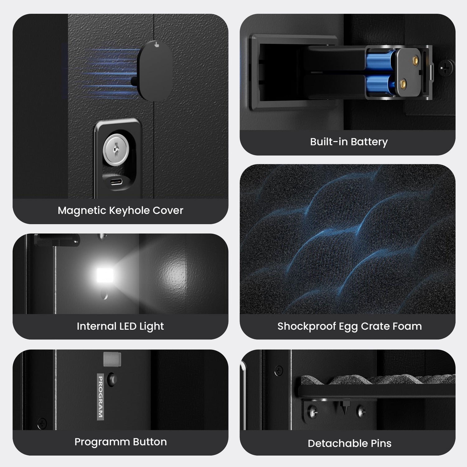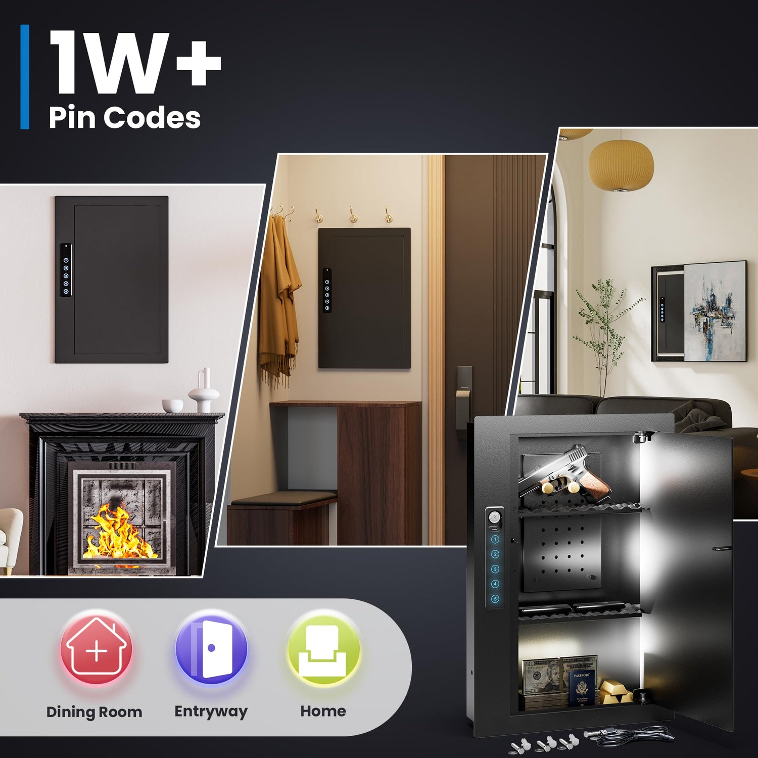 - 【Sturdy Anti-Theft Design In Wall Safe Between Studs】The closet safe constructed from heavy duty, features PIN code electronic keypad , hidden key hole with 2 keys and a USB emergency charging port for secure access at any time, caja fuerte para dinero