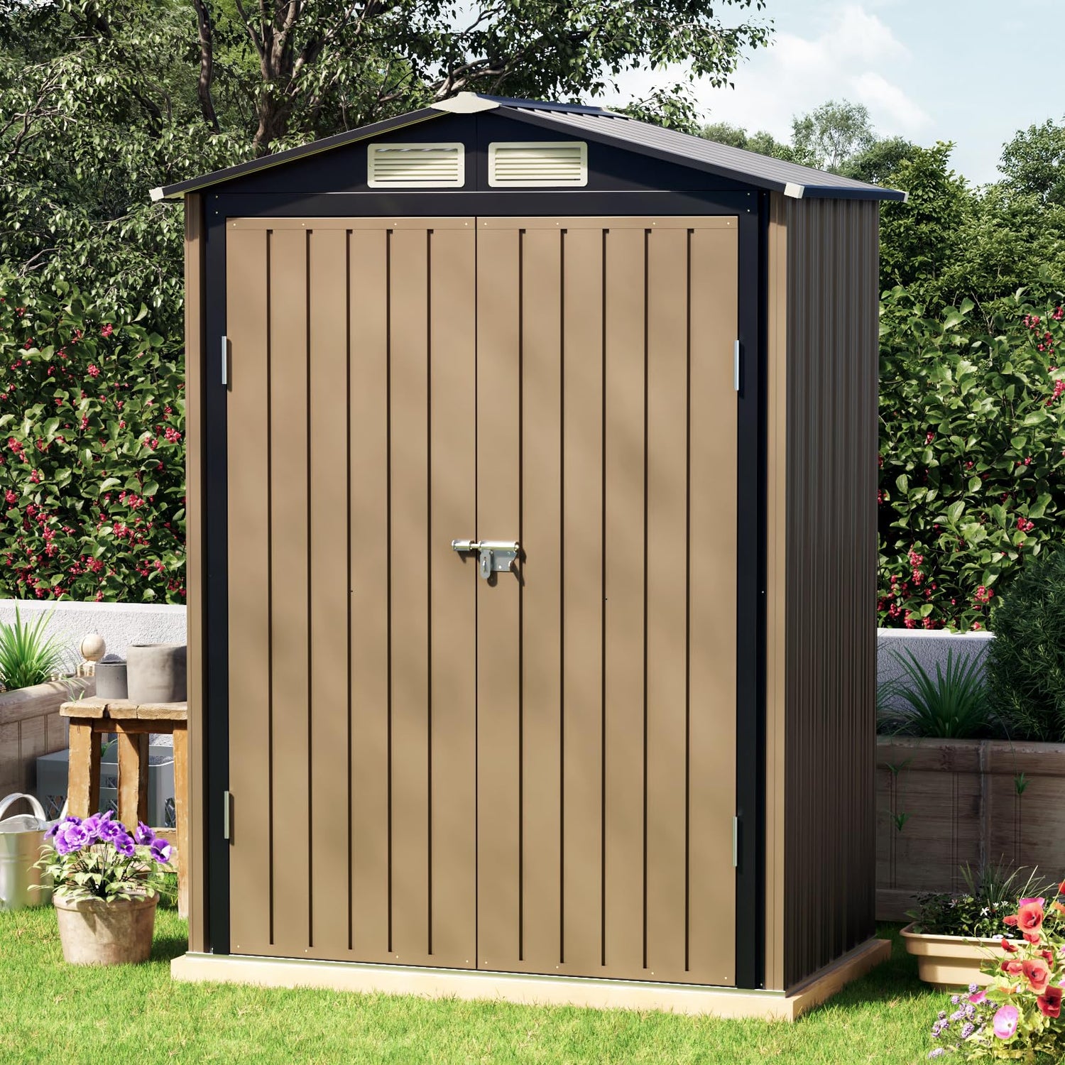 Grovellis 5x3 FT Outdoor Metal Storage Shed with Floor Frame, Double Door, 1 Clear Window, Tool Shed for Garden, Patio, Backyard Brown