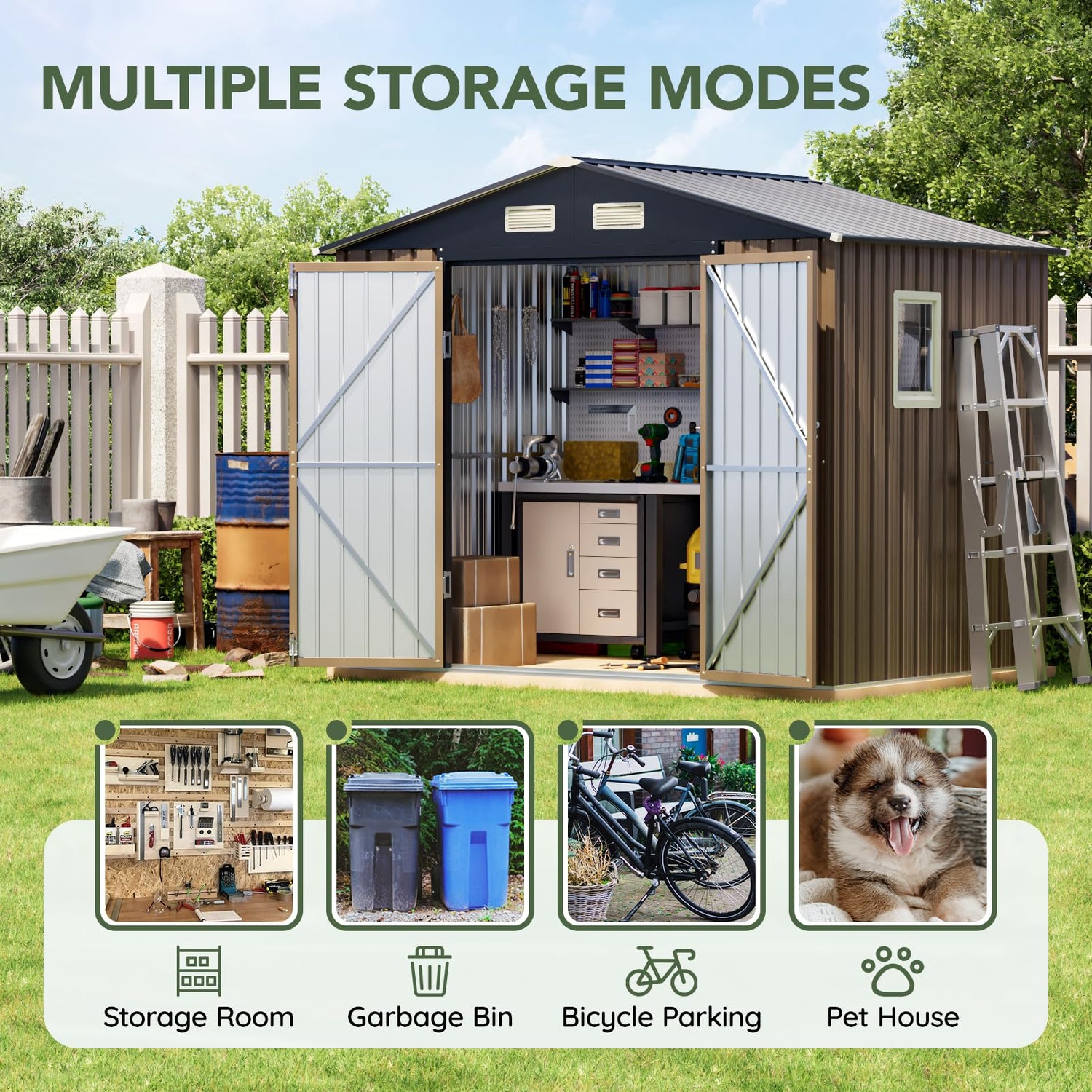 Grovellis 6x8FT Outdoor Metal Storage Shed, Double Door, 1 Clear Window, Tool Shed for Garden, Patio, Backyard Brown