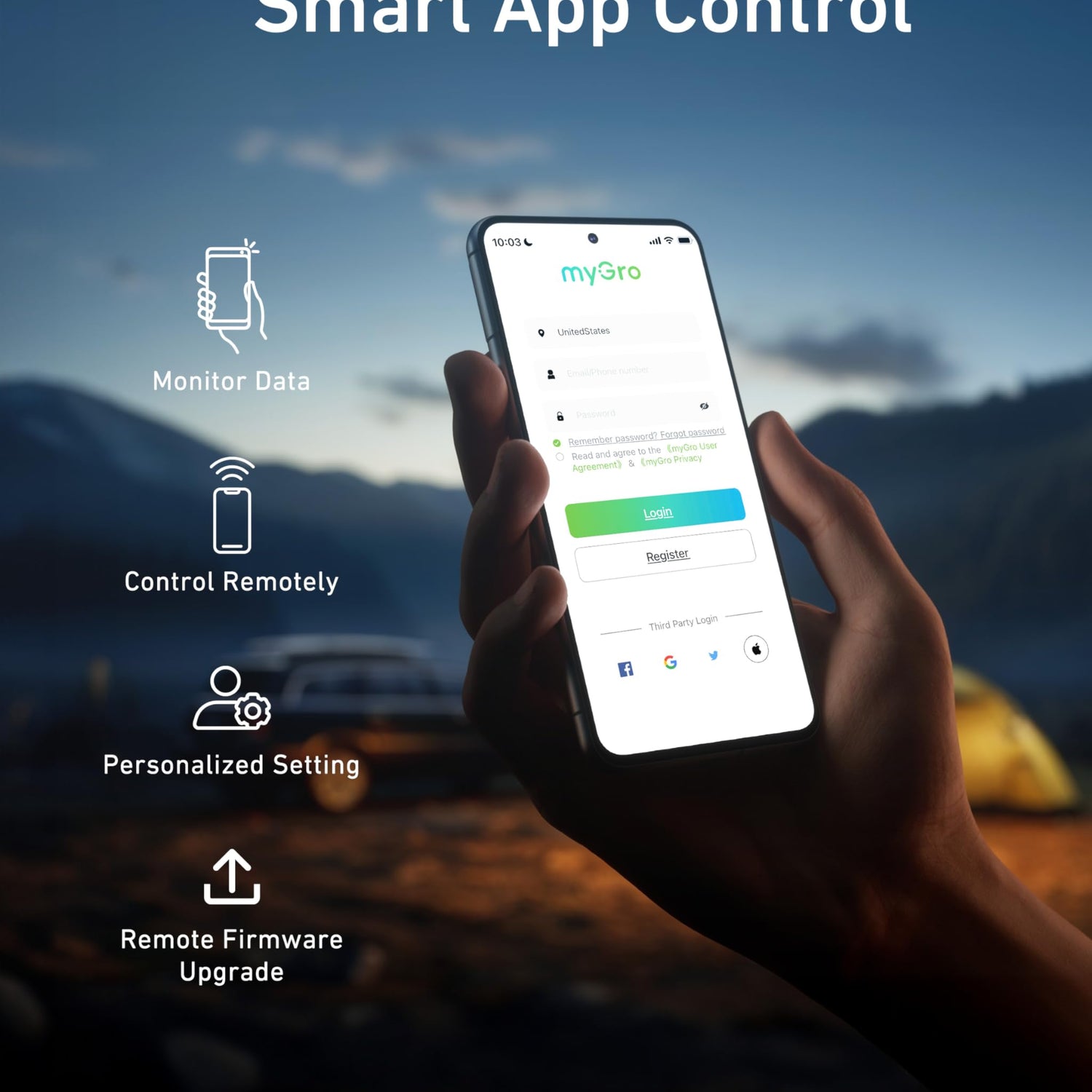- Smart App Control: The MyGro App empowers you to monitor the real-time status of your portable power station, remotely toggle switches, activate quiet charging mode, conduct remote firmware upgrades, and customize settings to your preference.
