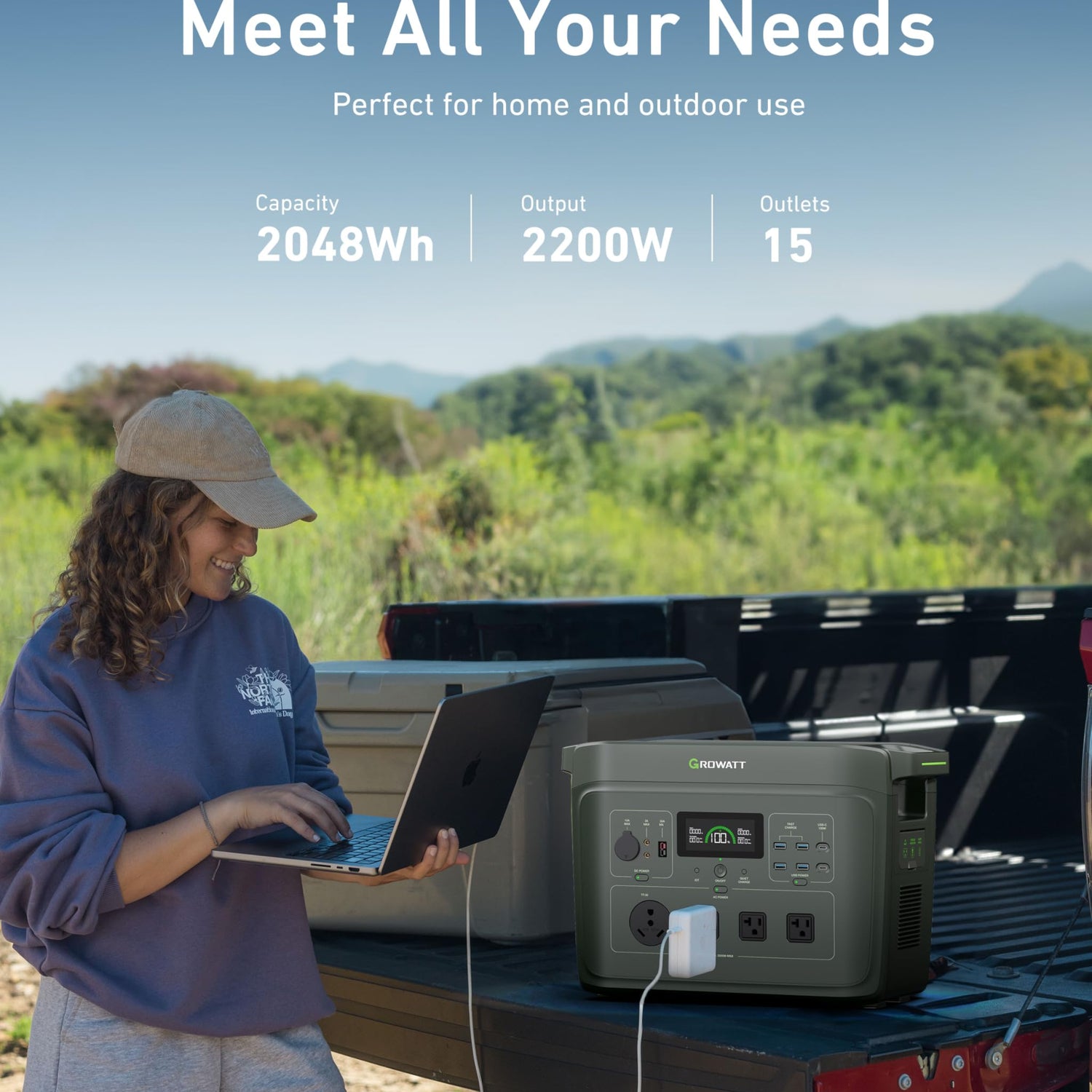 GROWATT Portable Power Station: Infinity 2000 Solar Generator 2048Wh LifePO4 Battery 2200W AC Output Expandable to 6144Wh,1.6H Fast Charging, for Home Use, Outdoor Camping, RV and Emergency Backup