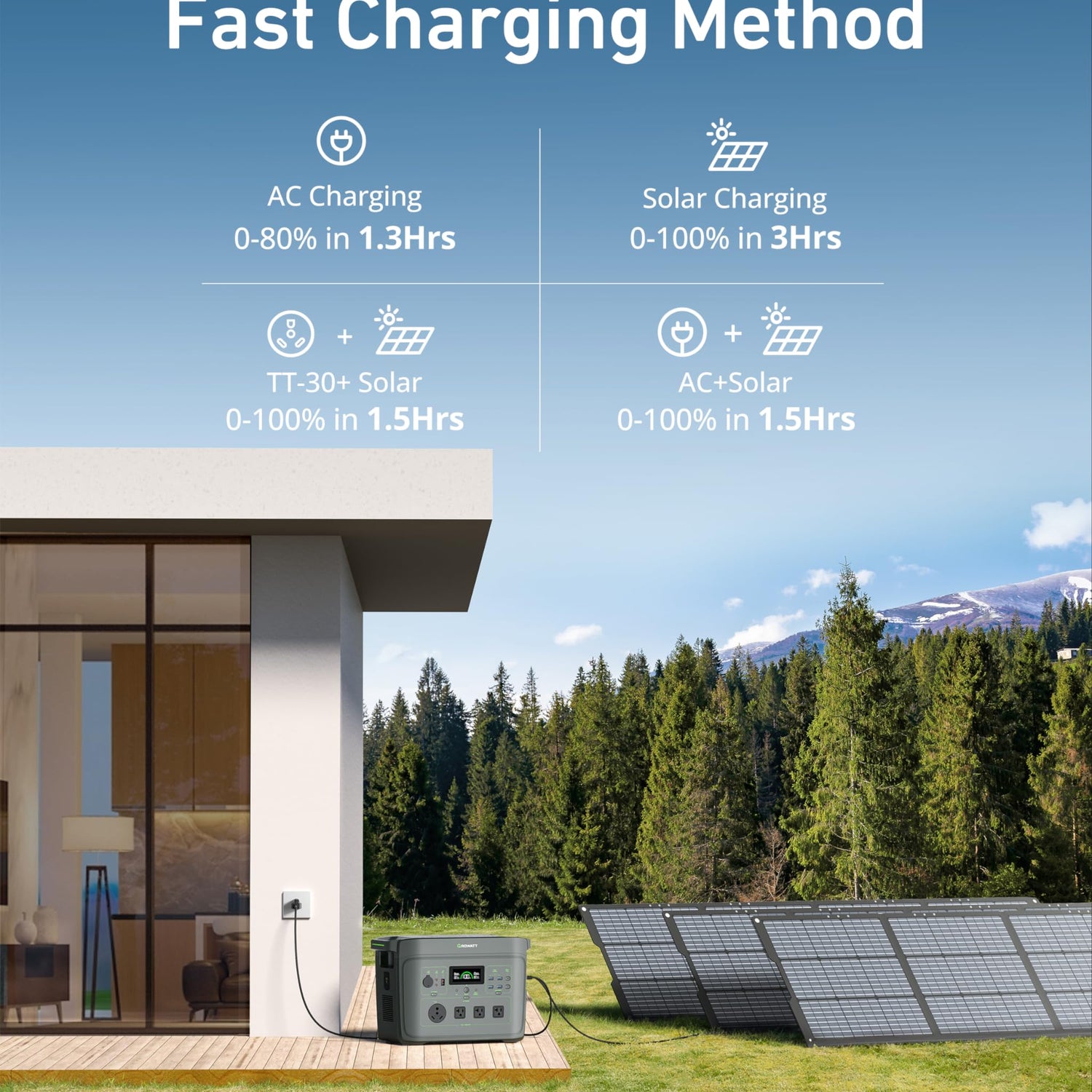 - Fast Charging:With an 1800W AC input, it only takes 1.6 hours to reach a full charge when you need home backup power.As a outdoor generator, it reaches full charge in just 2.3 hours with a 1000W solar input.Moreover, it supports combined charging, enabling both AC and solar charging simultaneously, resulting in a full charge in just 1.5 hours.