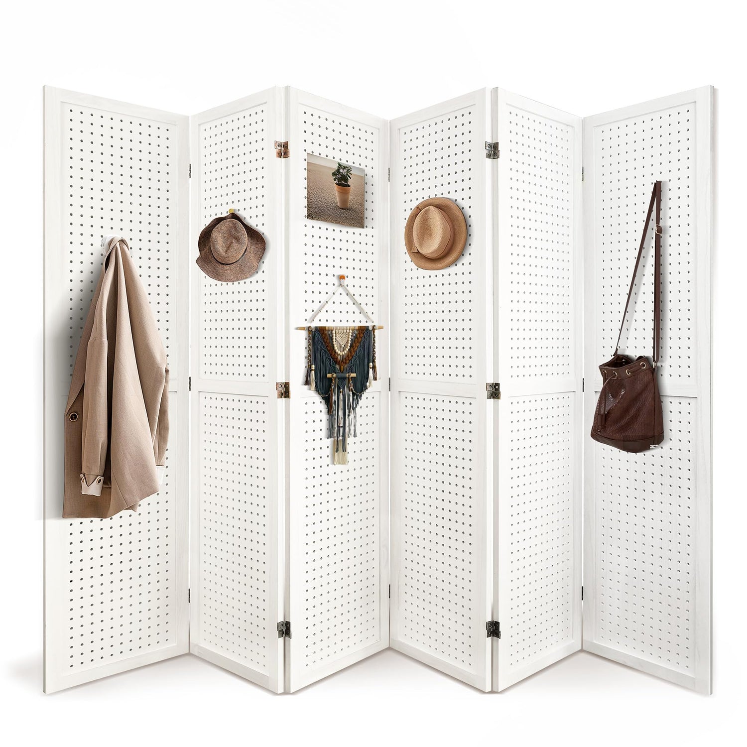 Grungis 6 Panel Room Divider with Pegboard Display 5.6FT Wood PegBoard Room Dividers, Folding Privacy Screens Portable Freestanding Partition Wall Divider for Art Shows & Room Separation, White