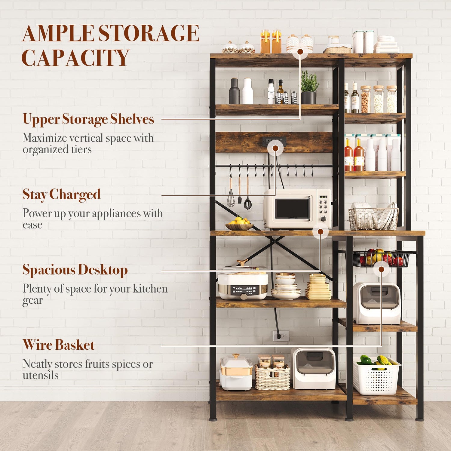 GRUSIGN Kitchen Bakers Rack with Storage, 6-Tier Coffee Bar Station with Power Outlet, Microwave Stand with 12 S-Shaped Hooks, Open Kitchen Storage Shelves for Spices, Pots and Pans, Rustic Brown
